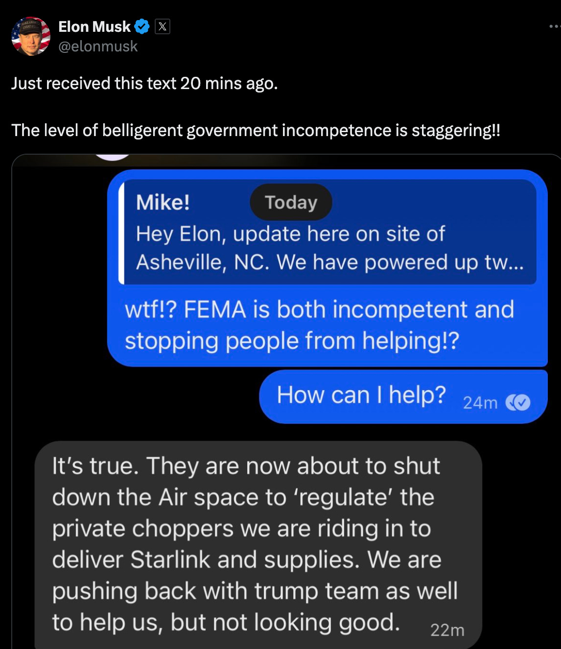 Musk also claimed that FEMA was blocking the use of Starklink satellites, and that an anonymous SpaceX engineer had told him that FEMA was “actively blocking shipments and seizing goods and services locally and locking them away to state they are their own. It’s very real and scary how much they have taken control to stop people helping.” There is no evidence, apart from the word of Musk, that any of this happened.