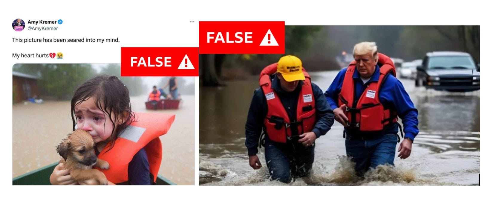 Instead of facing reality about climate change worsening storms, Trump supporters are being told that the government is controlling the weather. Instead of looking at what emergency responders are actually doing, they are sharing fake AI-generated images to fuel outrage about Biden’s alleged failures, or reassure the public that Trump is there to save the day. The image on the left was shared millions of times, while the one the right was shared more than 164,000 times on Facebook alone.