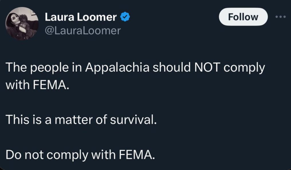Laura Loomer, the conspiracy nutjob who accompanied Trump to his debate with Harris, and who has been touted as a Trump spokesperson in a second administration, urged victims to not cooperate with FEMA.