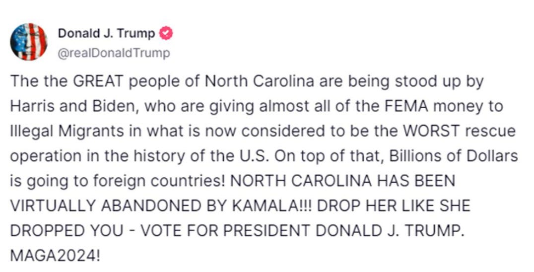 Trump: “They stole the FEMA money, just like they stole it from a bank, so they could give it to their illegal immigrants that they want to have vote for them this season.” Yeah, this is also untrue. But fun fact: Trump raided the FEMA budget to redirect money towards his immigration policies, including building a wall.
