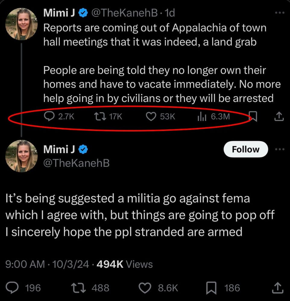 Emergency responders, as with many other public employees, now have to worry about their safety. A disturbing number of the lies about FEMA suggest that the only appropriate response is not just to disobey government directives, but also to target first responders with violence. The X comment below, again false, received more than 6 million views. It is typical of a strand of misinformation that suggests that FEMA is stealing resources from victims, or using the response to set up concentration camps, and then invokes the need for a militia (read: anyone with a gun) to respond.