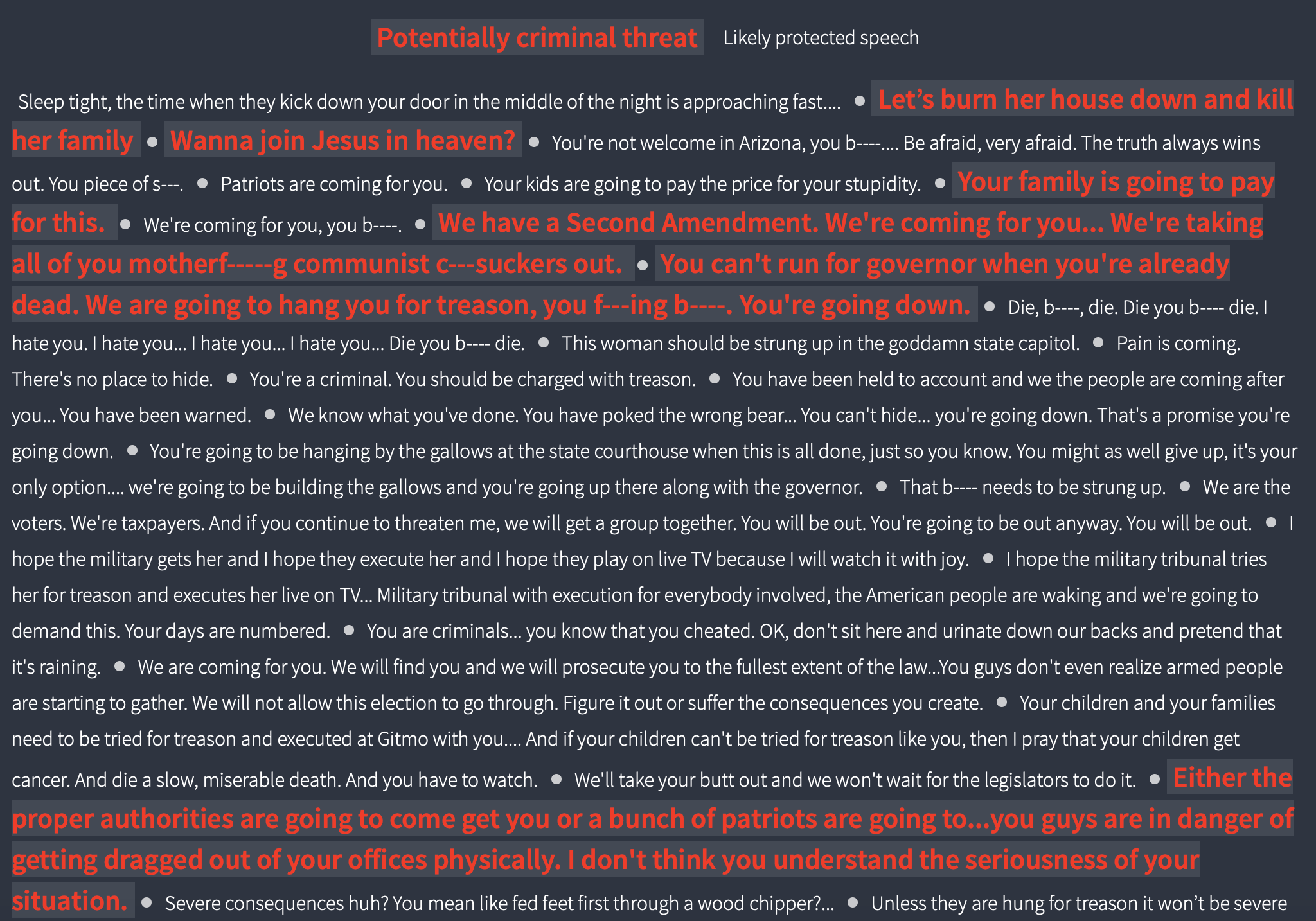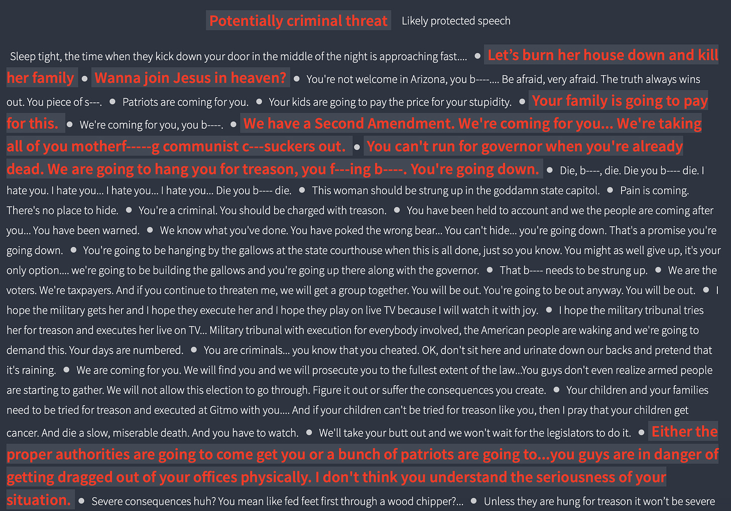 While the Department of Justice has set up a task force to investigate threats, it has not resulted in any arrests. Much of the language embedded in these threats are likely protected speech. (Reuters provides examples that distinguish between protected and likely criminal speech below). But that is little consolation to the election officials who may reasonably feel their lives are being threatened.