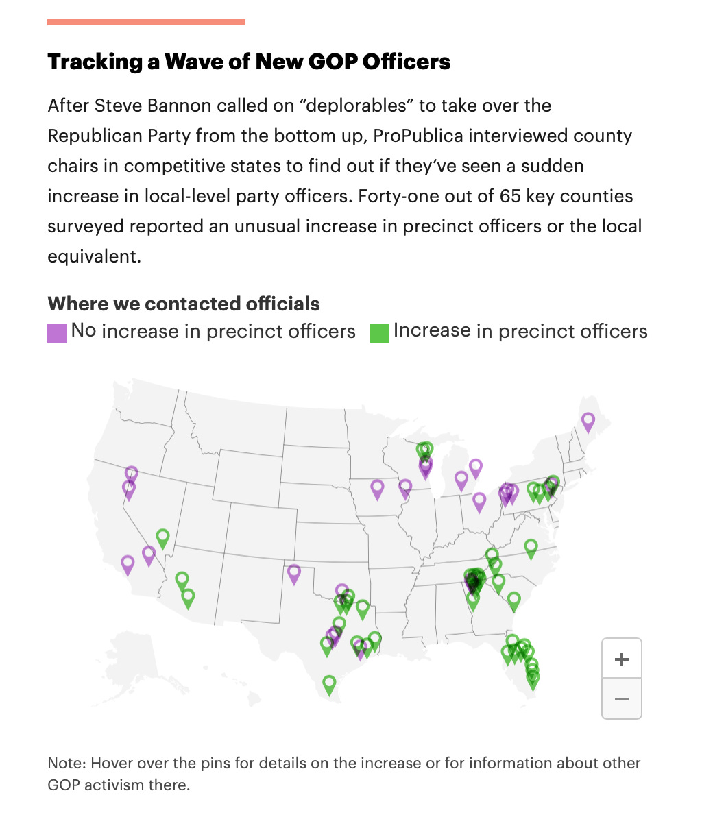 Why does this matter? In many places, local party organizations pick poll workers and the local boards that oversee elections. Gain control of the local level, and you gain significantly more control of the administrative machinery of elections.