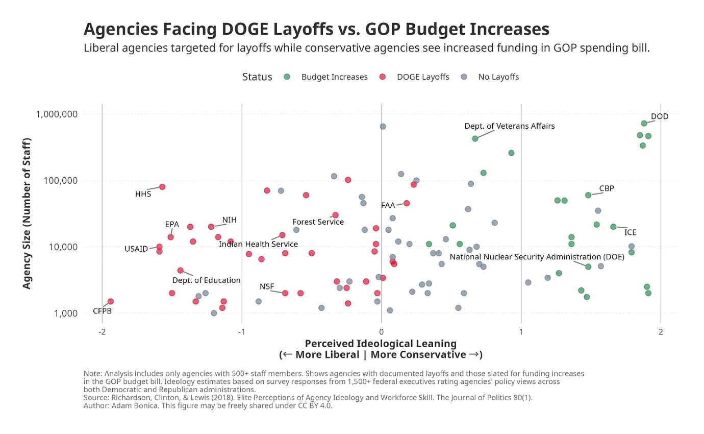 The pattern of cuts was partisan. As Stanford political scientist Adam Bonica has pointed out, agencies that are viewed as serving more progressive causes were disproportionately subject to DOGE cuts: