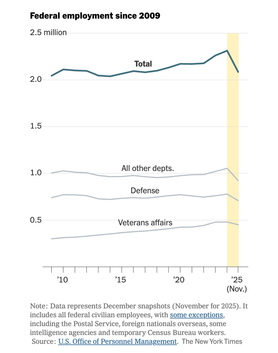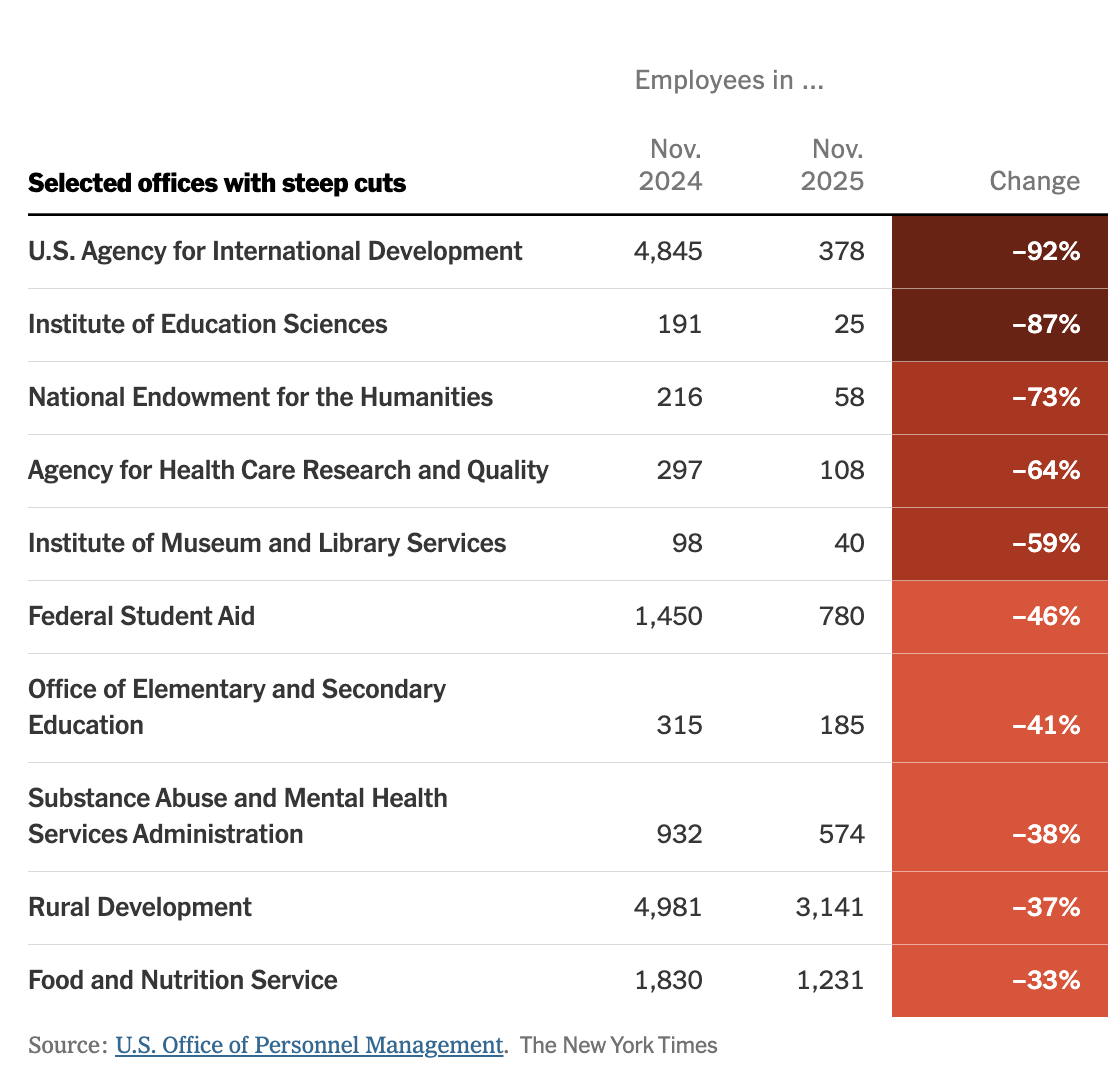 According to the Office of Personnel Management 322,049 employees left the federal government between the start of the Trump administration and the end of last year, resulting in a net loss of employees of about 220,000. DOGE played a key role, leading the elimination of probationary employees, pushing the “fork in the road” resignations, and being involved in Reductions in Force. It notably made no meaningful effort to distinguish between good and bad employees in the purges.