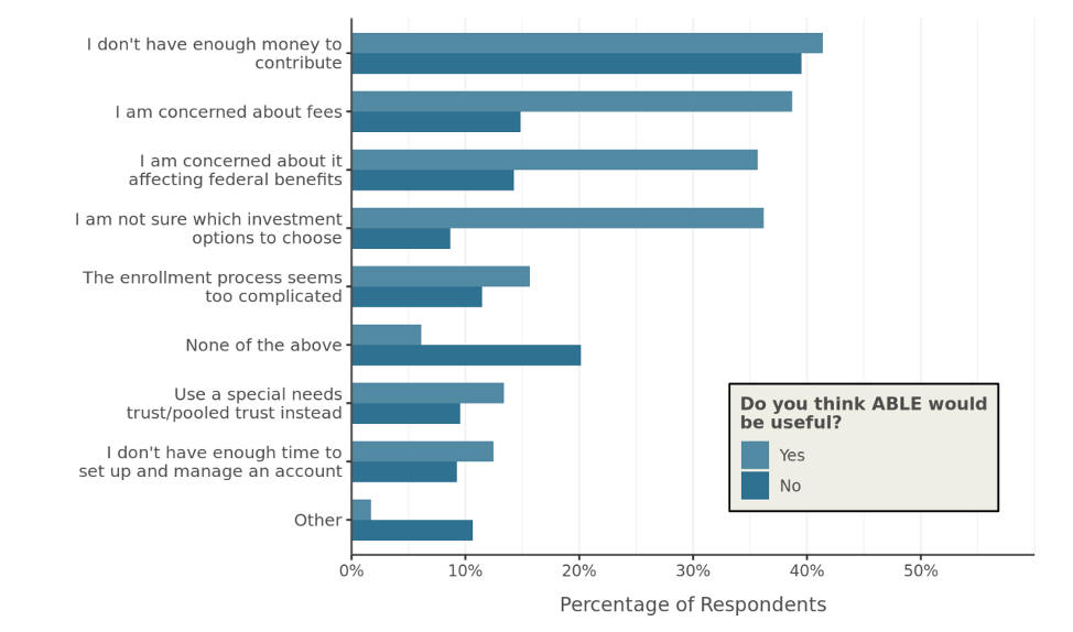 ABLE requires the ability to set aside money. People’s limited income and resources were the most widely cited barrier to opening ABLE accounts. Several interviewees and survey respondents who had not opened an account told us that ABLE accounts might not be useful given an inability to contribute to the account. Such constraints reflect the life circumstances of most SSI recipients. To qualify for SSI, people with disabilities must have quite limited earnings and assets. Thus, they may not have enough money to save. More generally, people with disabilities face substantial challenges to financial independence. As identified in national surveys, only 10 percent of people with disabilities were characterized as financially healthy (versus 30 percent of those without disabilities). Seventeen percent lived in households with less than one week of expenses saved.