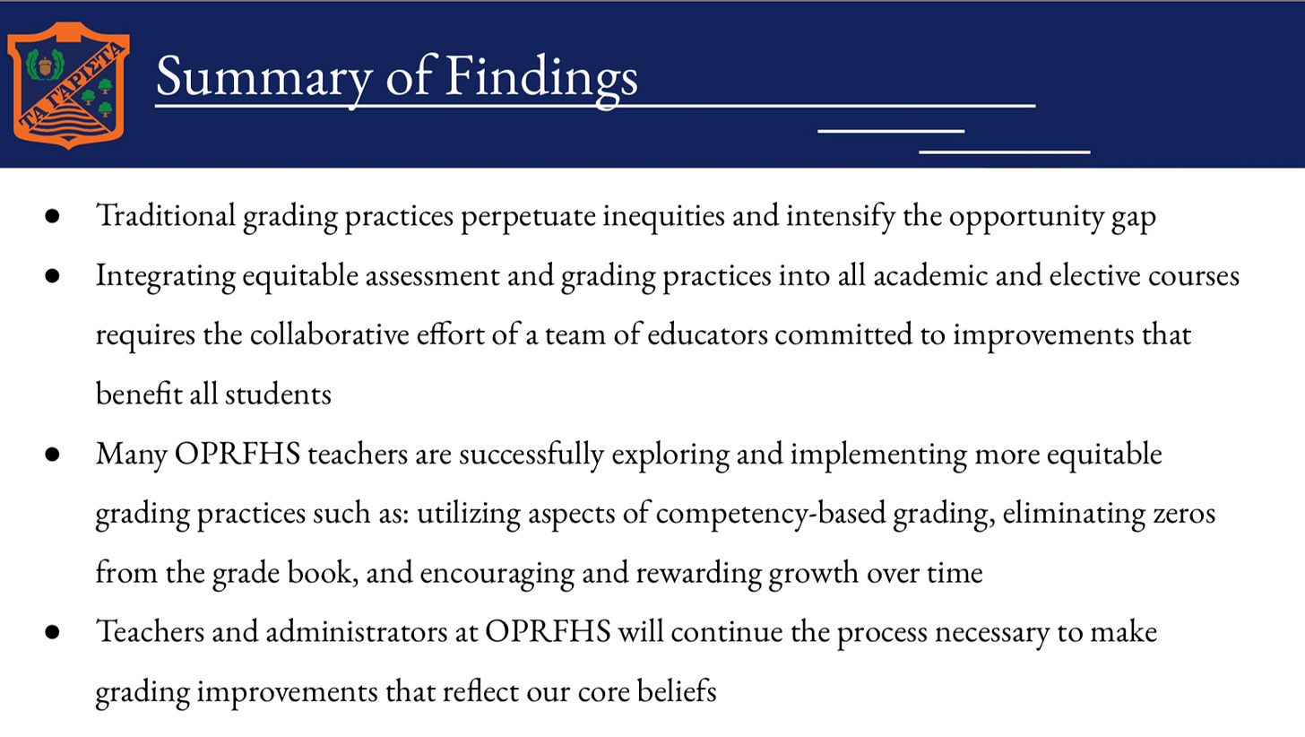 As part of the Board of Education’s strategic plan, the OPRFHS Grading and Assessment Committee was formed to examine national research on objective, unbiased practices for determining whether students have mastered academic content. At the Board of Education’s May 26 meeting, the administration’s representative to the OPRFHS Grading and Assessment Committee provided an initial report that included a progress update on the committee’s examination of grading practices.