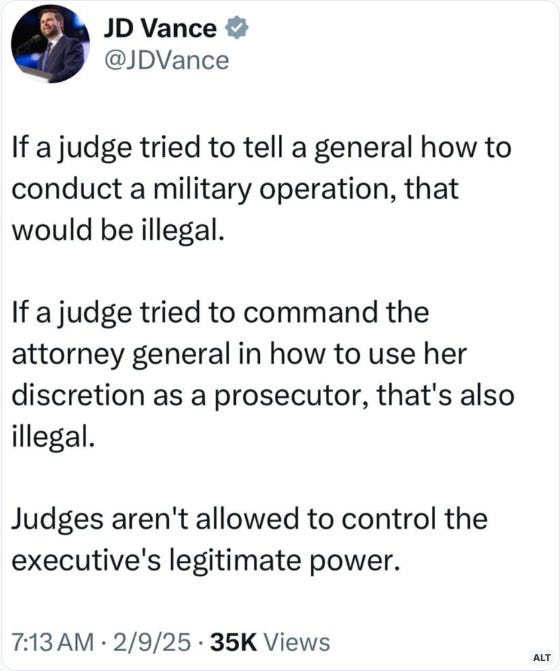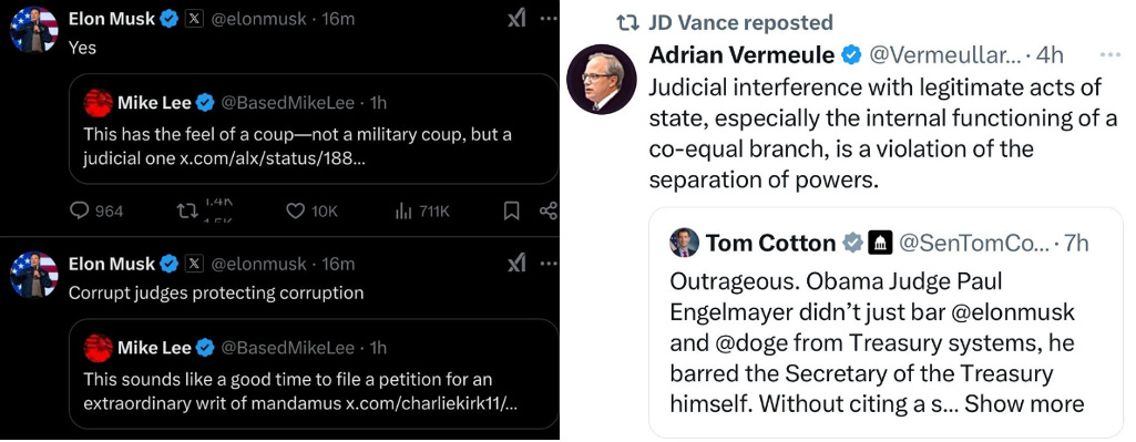 I am becoming more nervous about this. Over the weekend, you could see Vance, Musk and the online right attacking judges restricting Musk’s and Trump’s actions, and working them up to a point that they would justify ignoring such judgements.