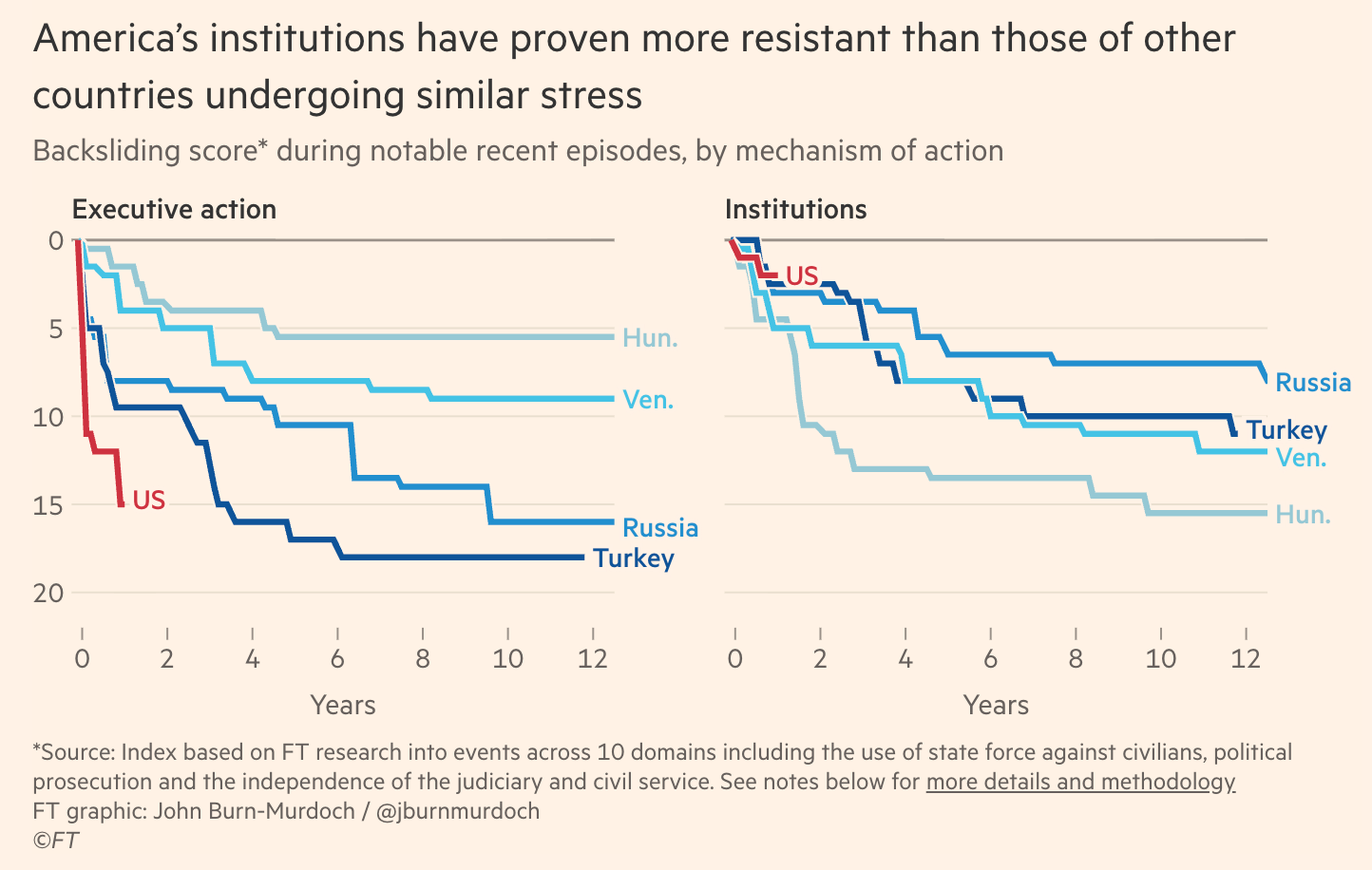 Murdoch does find reasons of optimism. He distinguishes between actions by the autocrat and lasting policy changes. Trump has done more of the former, but less of the latter. He also notes that in the US most of backsliding occurs via shocking abuses of power rather than Trump capturing other institutions. This offers, he says “a glimmer of hope for the US in the fact that many of its institutions and processes appear far more resistant to takeover than those that have crumbled underfoot elsewhere.”