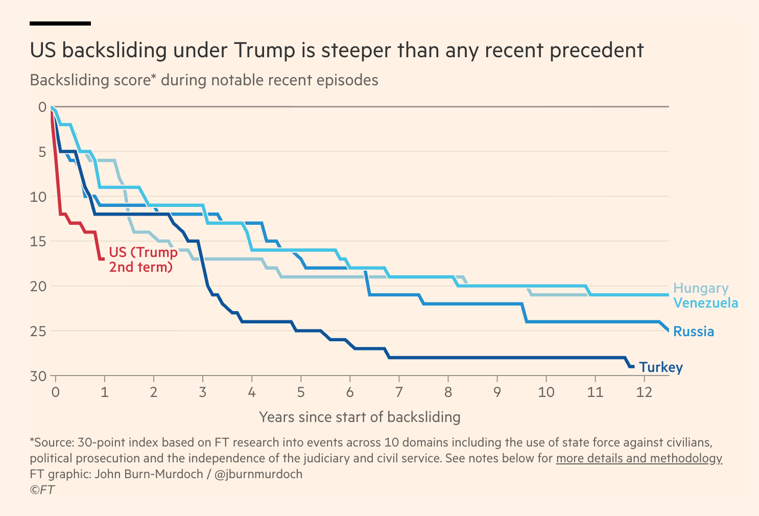 The Financial Time data journalist John Burn-Murdoch has provided a visual confirmation of the speed of democratic backsliding in America. And it is striking.
