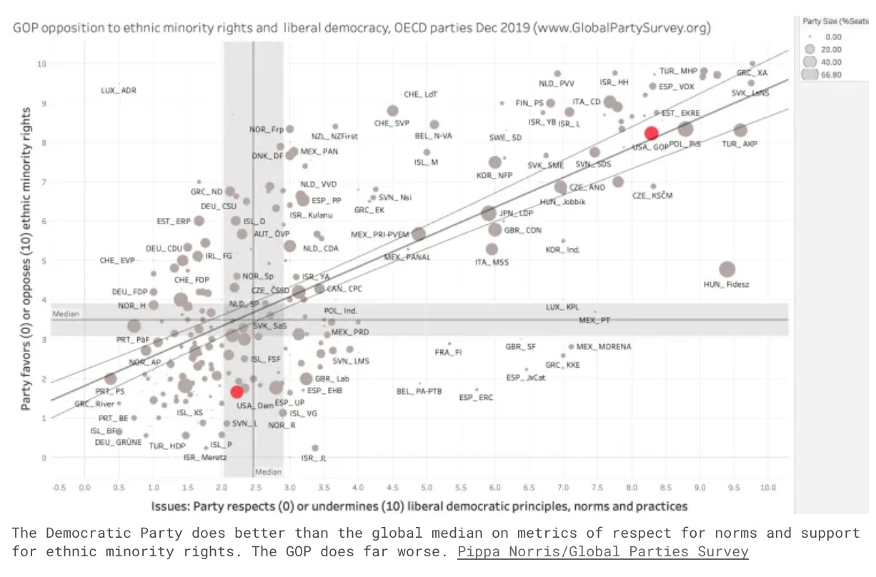More openly partisan institutions, like Trump-aligned media and the Republican Party have for some time now been willing to go along with anti-democratic practices. This graph from 2019 is based on expert assessment of party commitment to democratic principles and protecting minority rights. There is a a huge distance between Republicans (the red dot on the upper red corner) and Democrats (the red dot in the opposite corner), with the GOP appearing broadly opposed to individual rights and liberal democracy. This was the institution that Trump built his anti-democratic project with, ineptly at first, but now with greater sophistication.