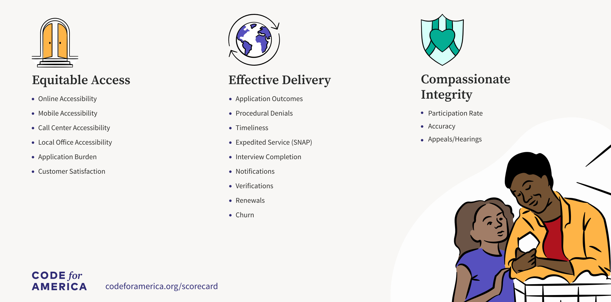 Another approach is to look at objective measures of user experience. Code for America has developed a comprehensive scorecard in the context of safety net services, including how much time it consumes. Each of the items below