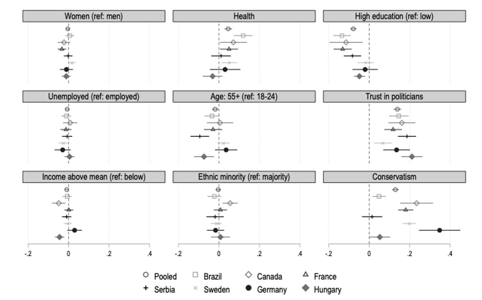 Across multiple countries, we find a number of consistent predictors of burden tolerance. Women, older adults, those with higher education and those in poorer health are generally more opposed to burdens. People who identify with a conservative ideology and trust the state are more likely to support burdens.