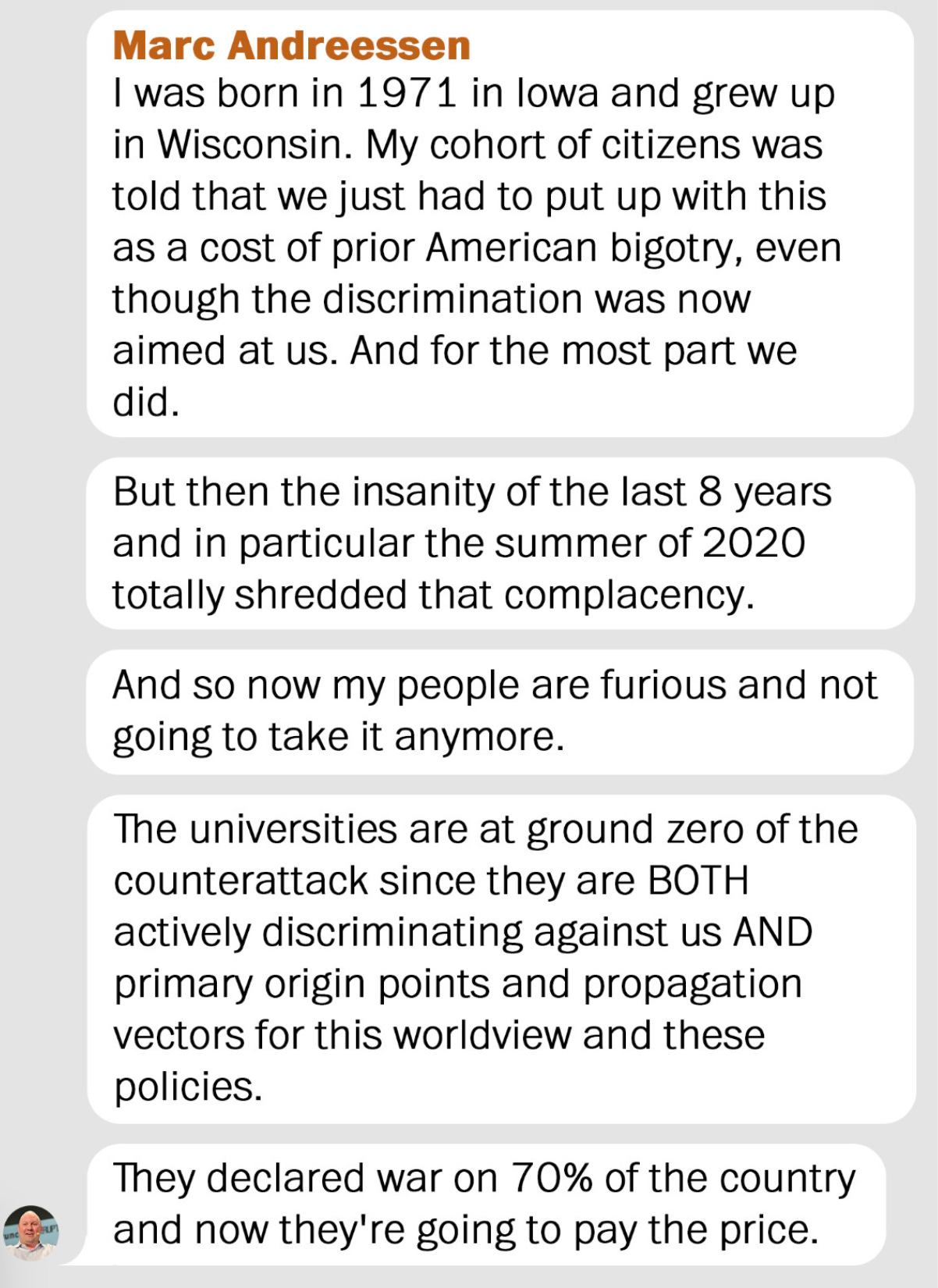 And it’s worth dwelling on this. Take Andreessen. Recently revealed group chats find him justifying his shift to the right as a proud midwesterner. “My people” he says put up with discrimination.