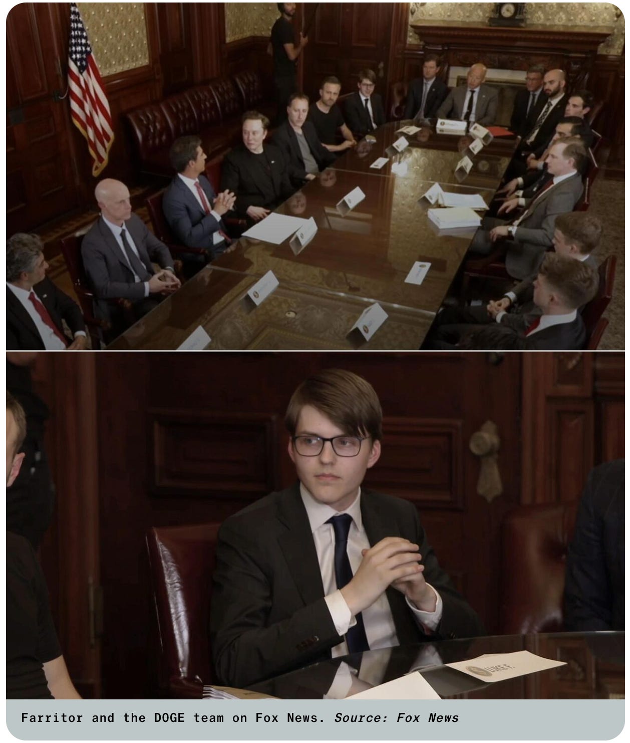 That attitude was common. DOGE appeared to have been a mix of people already in Musk’s orbit, or those hoping to get his attention. Sahil Lavignia recalled a meeting where Musk met with DOGErs offering general criticism of government but not engaging on any sort of practical detail. “It’s almost like this is one of the things you get for working at DOGE. You get to hang out with Elon once in a while.” Farritor achieved his goal, becoming a trusted DOGE aide who joined Musk on Fox News.