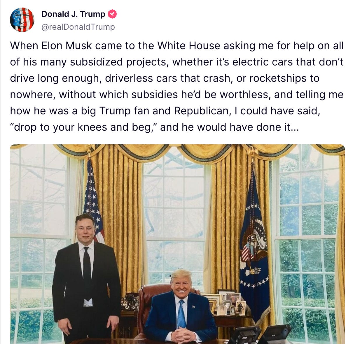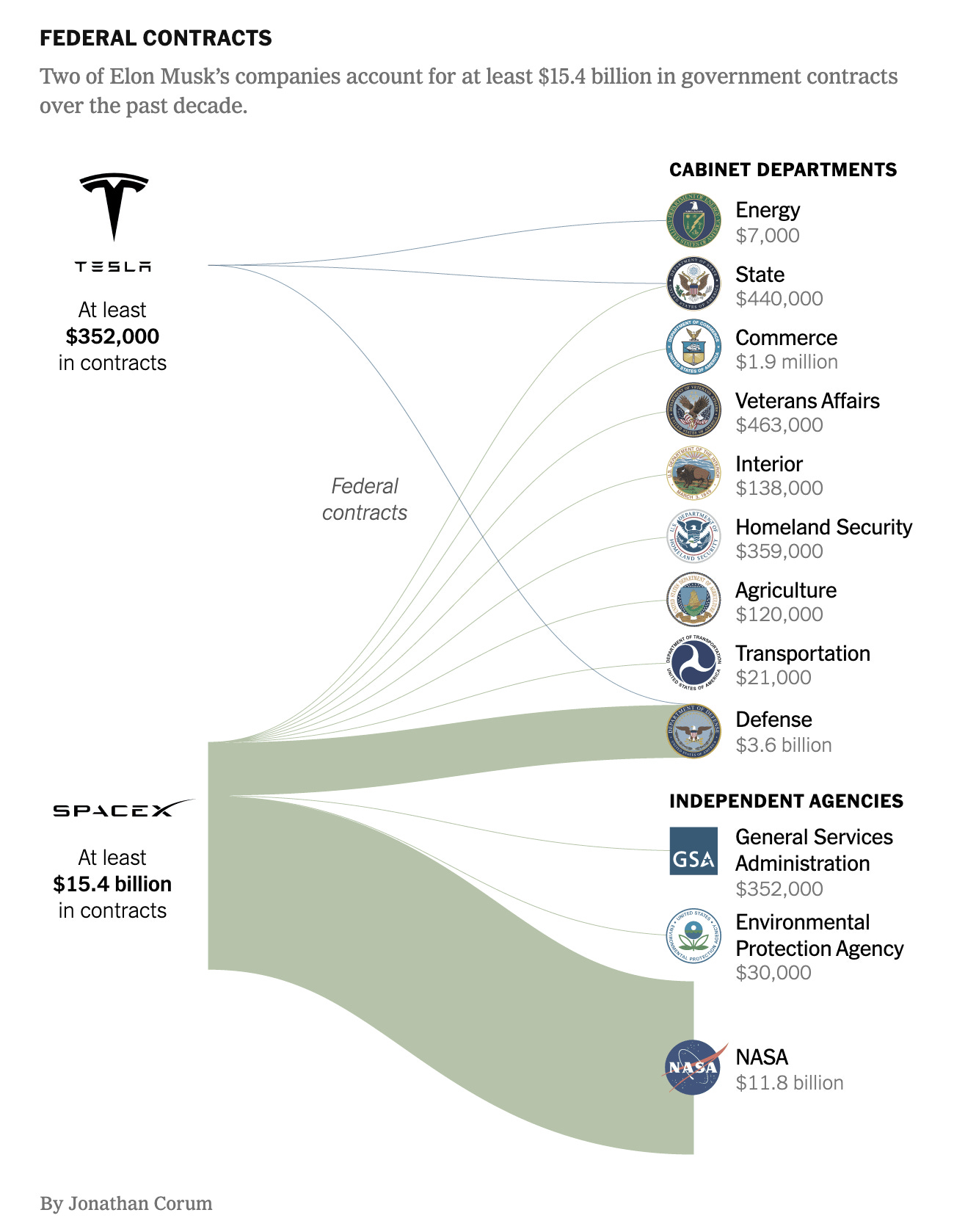 In other words, Musk is intimately involved in government, and vocal and litigious in opposing what he sees as government undermining his interests. It takes no great leap of imagination to identify that it is these business interests, rather than some abiding concern about government efficiency, that is motivating his sudden desire to be given a chance to threaten to cut specific public agencies.