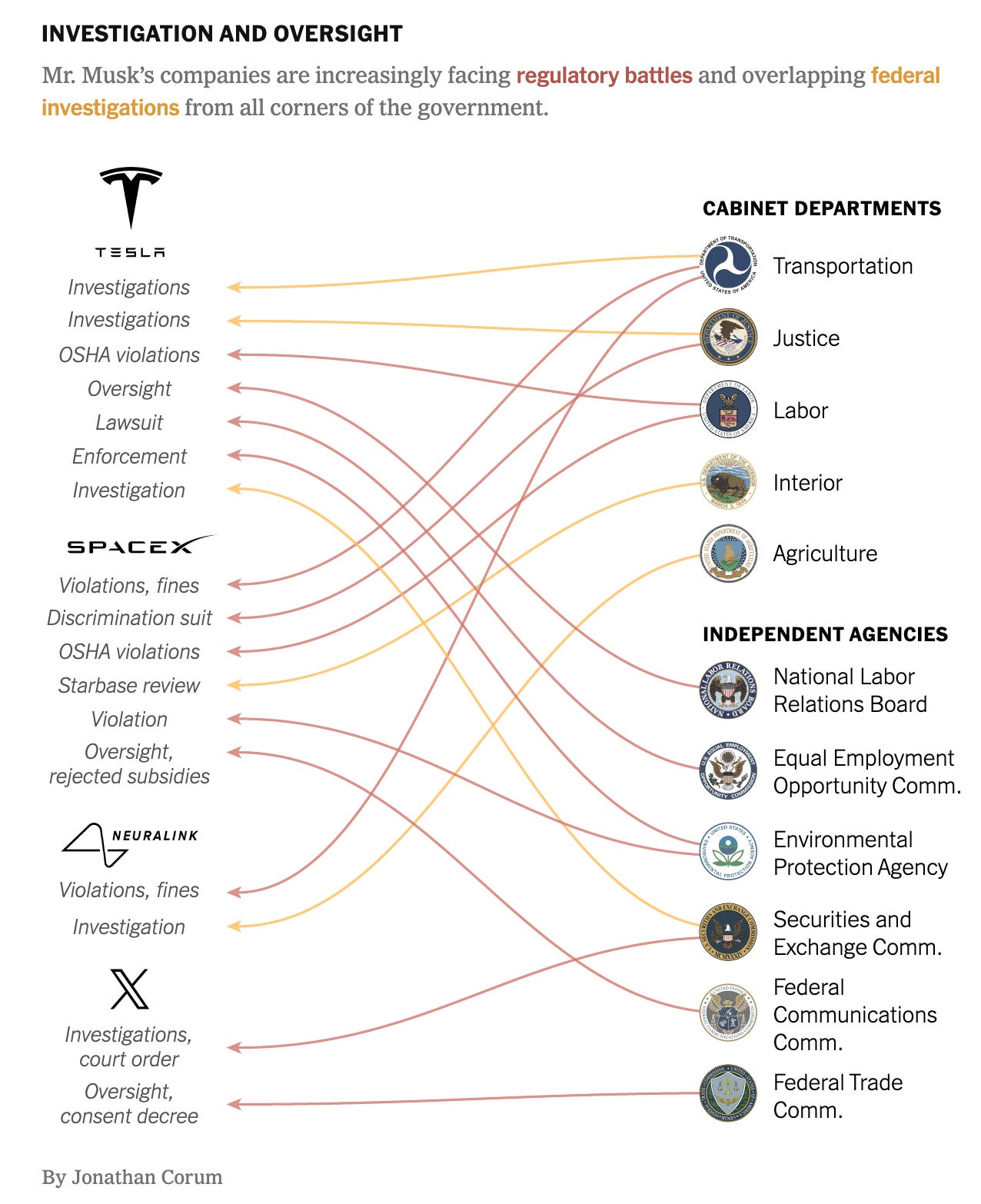 First, as a private businessman, he is subject to regulation. Musk tends to push or even ignore the law. This creates legal risks for him. For example, he has had a long-running feud with the SEC about public statements he has made about stocks and his takeover of Twitter, causing him to pay a $20 million fine and label the regulators as “bastards.” He has complained that other government regulators are limiting his Space X work, and has proposed that NASA should cancel a contract with Boeing, his main competitor in publicly-funded space travel. He is suing Federal Aviation Authority after a fine for repeated safety violations. The National Highway Traffic Safety Administration has multiple investigations into crashes associated with Tesla’s self-driving mode. He is fighting punishments by the National Labor Relations Board for his anti-union actions. The list goes on and on.