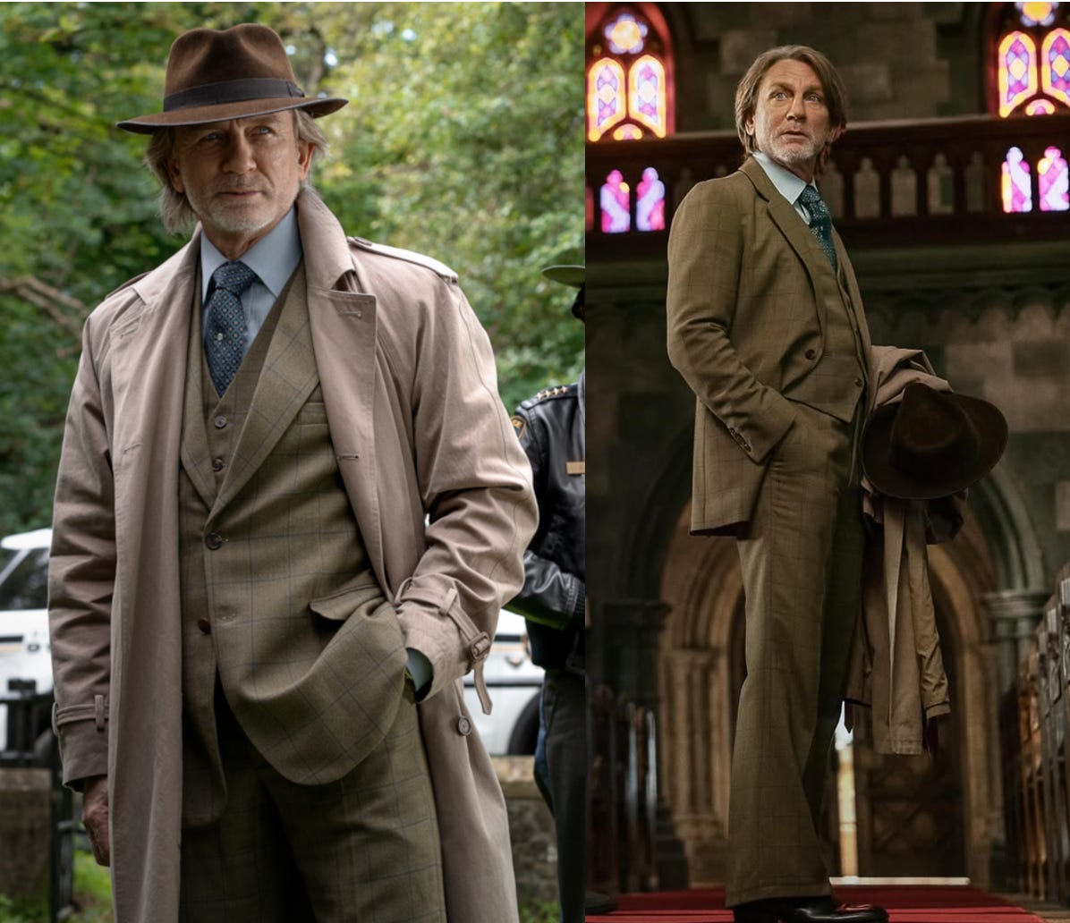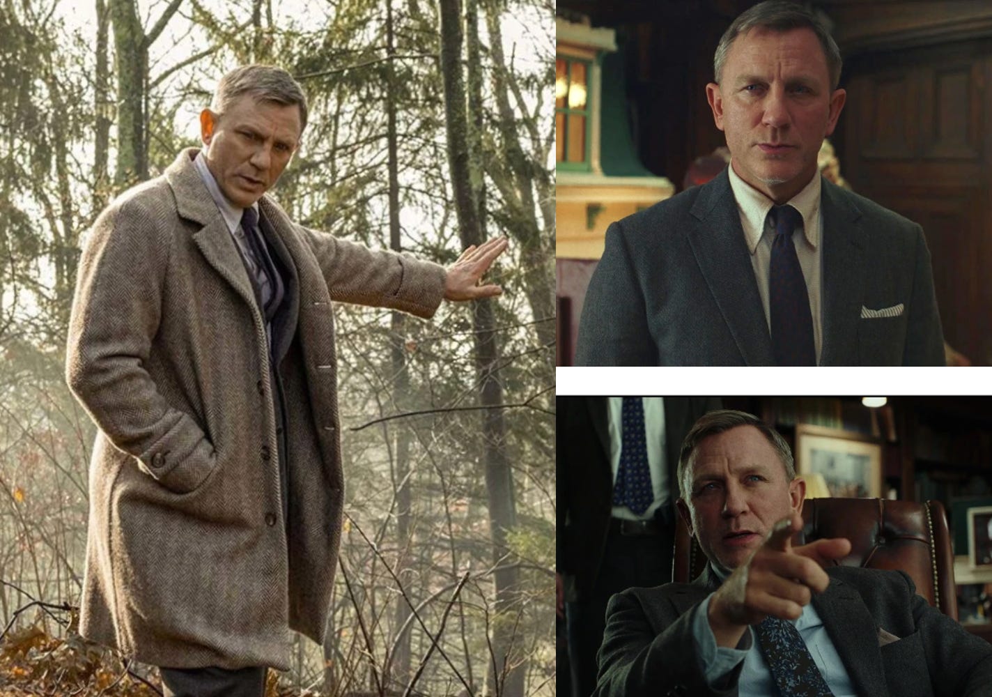 In the first movie, Blanc is presented as “A Gentleman Sleuth” with a southern accent that one character compares to Foghorn Leghorn. He dresses formally, in tweeds, and beautiful overcoats. The fake New Yorker profile of Blanc that characters refers to in Knives Out describe him as looking like a “rumpled, athletic classics professor” but he has some standout moments, such as braces and floral ties.