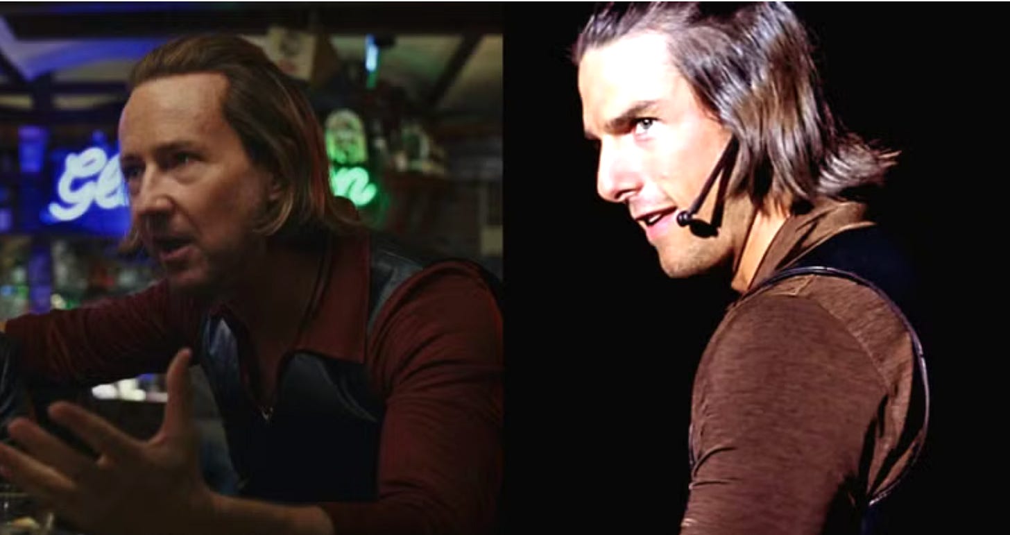 The fashion choices of the movies fit are part of a rich palette, containing visual gags that invite repeated viewing, such as a portrait whose visage changes as the plot does in I. My favorite is in Glass Onion, where Ed Norton wears Tom Cruise’s pick-up artist ensemble from Magnolia, a good indicator that his greatest skill is persuasion rather than creation.