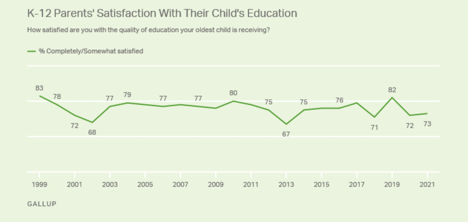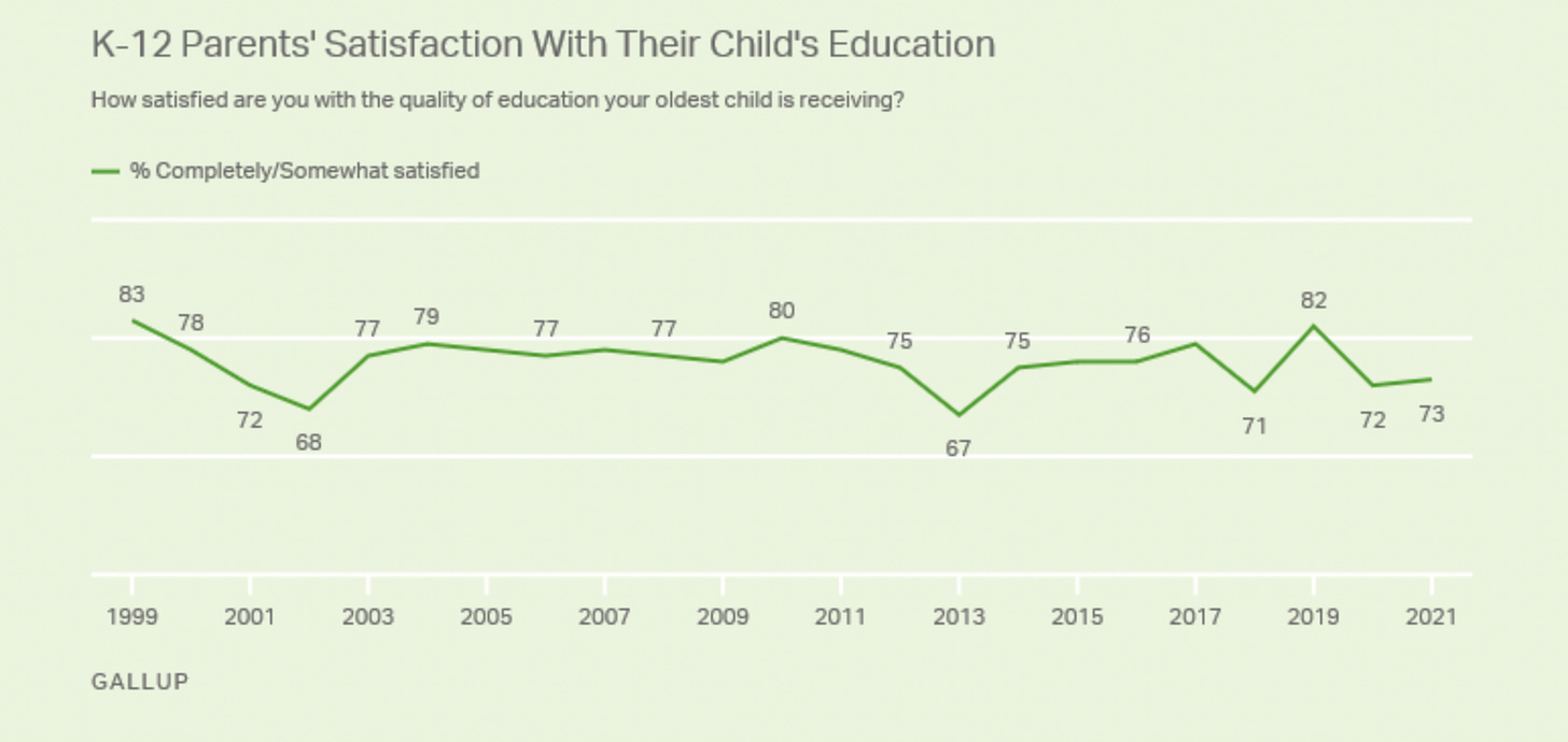 The weird thing about it is that most parents are happy with their kid’s school, even Republican parents. There is certainly a drop in parental satisfaction that accompanies the pandemic, but not to historically low levels.