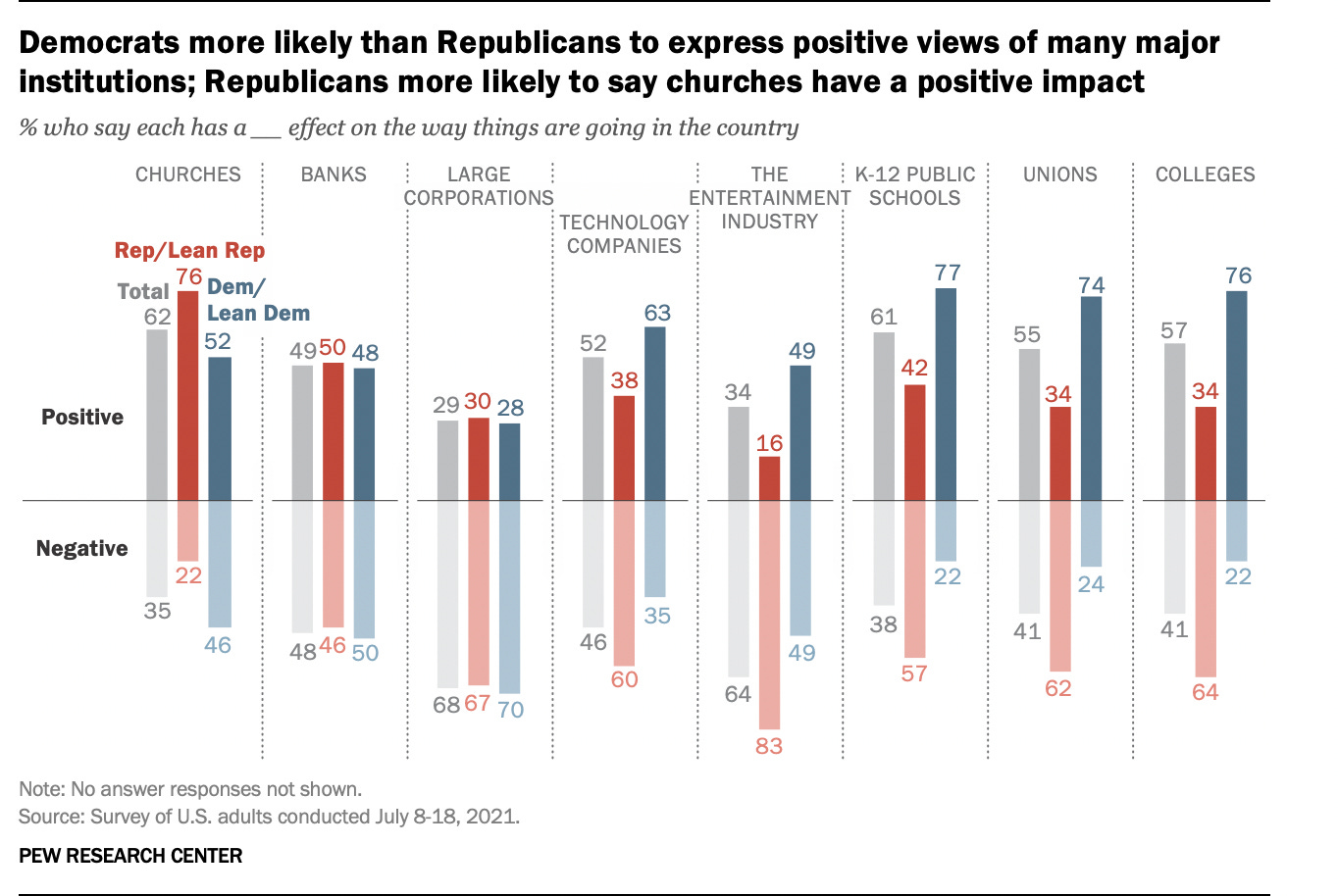 There are plenty of polarized and negative views about public schools. This partly reflects a reshaping of the conservative movement to one that is distinctly anti-institutional. Churches are the only of the listed institutions below that enjoy majority support from conservatives. This shift is especially obvious in the domains of education, where 57% of Republicans and two-thirds of conservative Republicans say public schools have a negative effect on America.