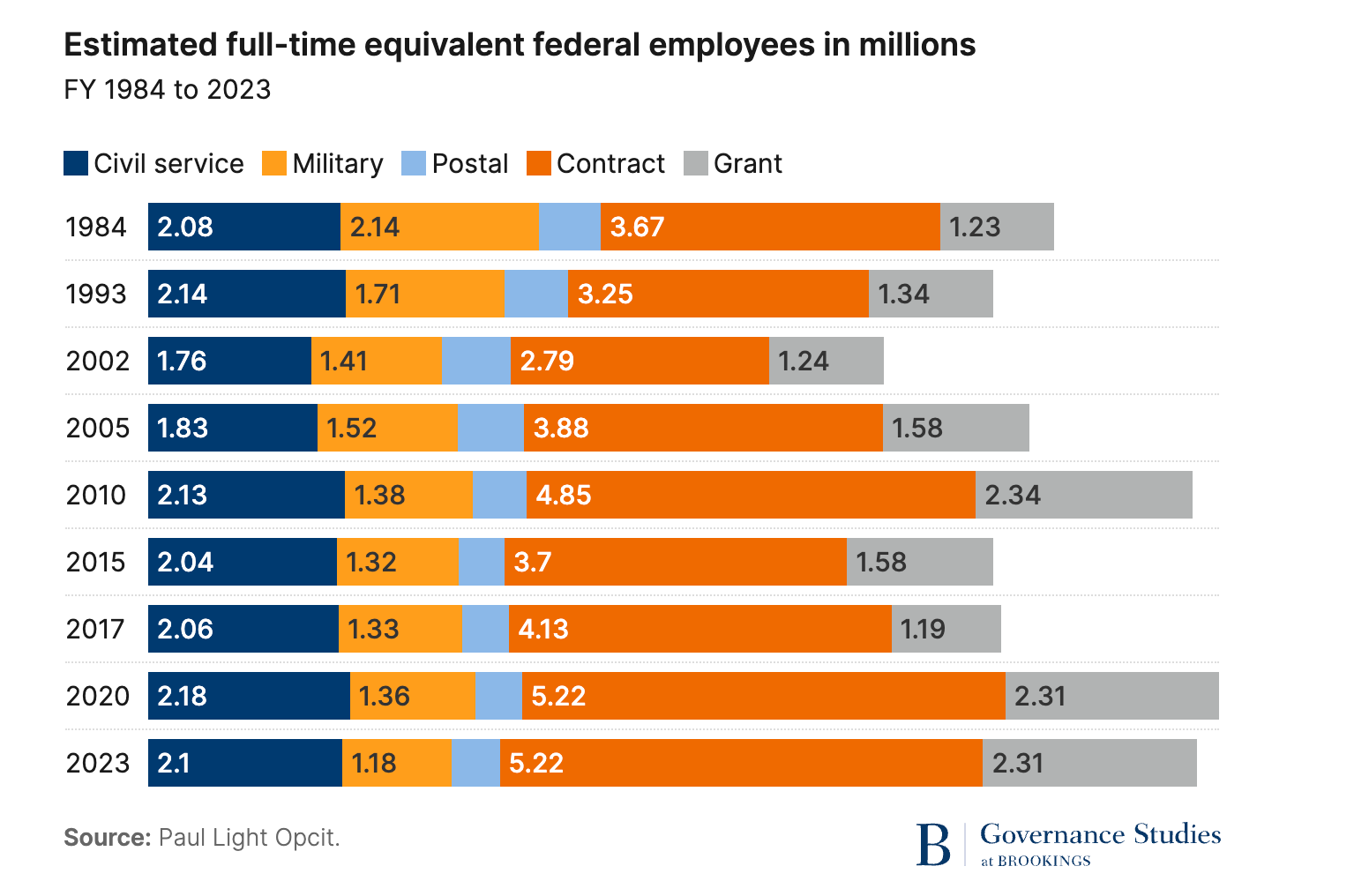It is estimated that 5.22 million contract employees and 2.31 million grant employees work under federal contract. Some contractors work in state and local government which comprises 12% of the U.S. workforce - double what it was in 1970.
