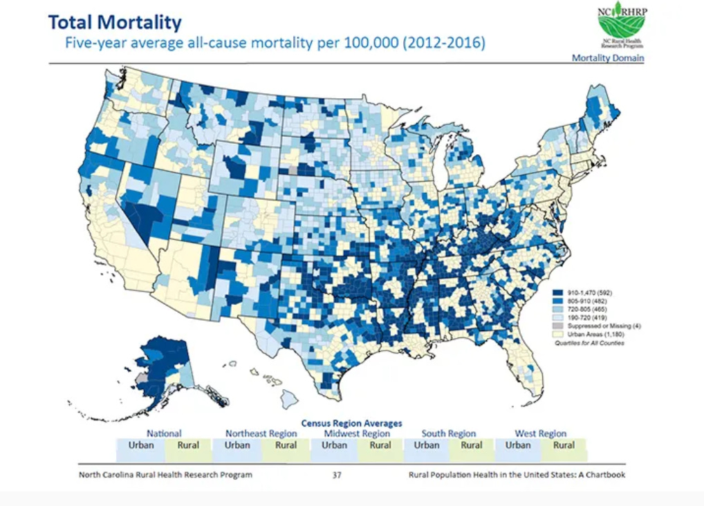 It’s not just income and race. Where you live also matters. People in rural communities face significantly higher mortality risk. The map below shows the rural concentration of mortality. Explanations for the rural disadvantage range from limited access to health care to high rates of ‘deaths of despair’ or hopelessness, reflected in epidemic levels of drug overdoses, alcohol-related deaths, and suicides.