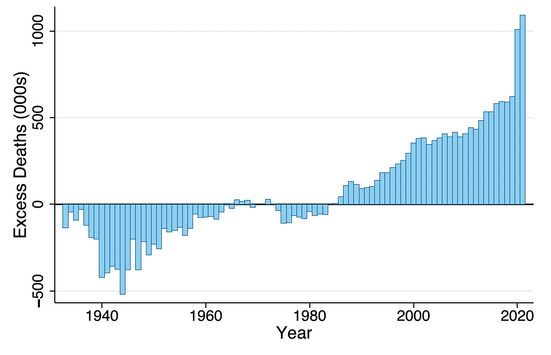 During the COVID-19 pandemic, the number of missing Americans rose to over 1 million lives per year. Cumulatively, we lost about 10,000,000 Americans since the 1980s– effectively, this was as if we’d wiped out Los Angeles, Chicago, Houston, and Phoenix.