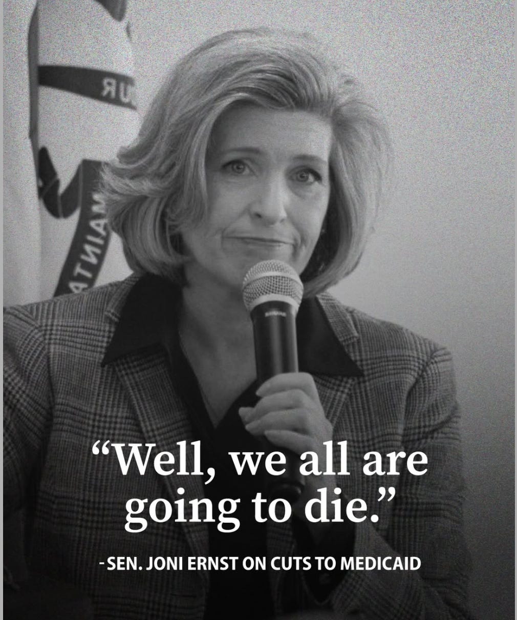 When confronted by a constituent claiming that “people are going to die” from the massive Medicaid cuts in Trump’s just-passed Big Bad Bill, Iowa Senator Joni Ernst flippantly responded that “we are all going to die.”