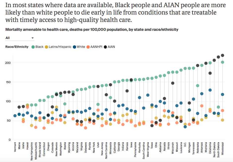 Our short average lifespan compared to other wealthy nations masks even worse inequities within. Across any dimension - income, geography, or race - those with less, experience more death. These gaps have widened over time and the pandemic super-charged this trend.