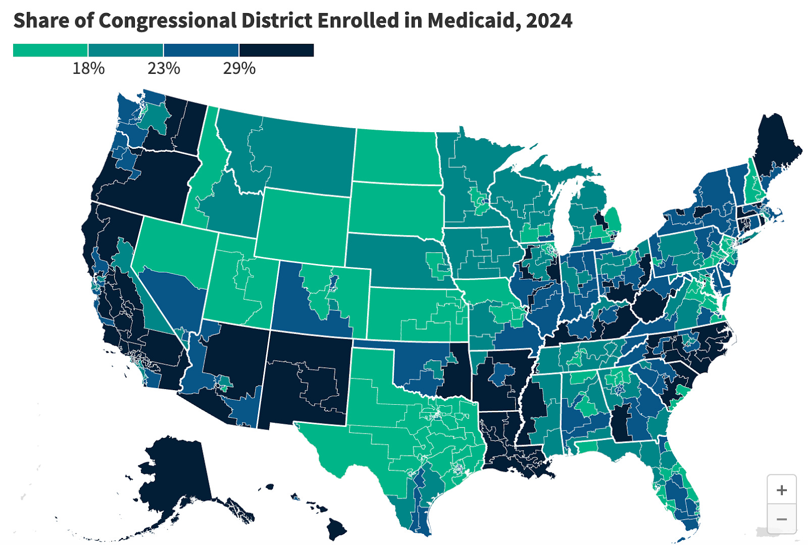 The map below shows the geography of Medicaid enrollment by Congressional District. Many House members represent districts where 30% or more of their constituents receive health care through Medicaid. Some are in blue areas such as the West Coast, New York, and New Mexico and purple states like Arizona and North Carolina. Many however are in deeply red districts in Louisiana, Kentucky, West Virginia, Arkansas, and Oklahoma - the same places with the lowest levels of life expectancy. Fundamentally, this bill represents a broken promise to those voters who believed President Trump’s assurances that Medicaid would be left alone.
