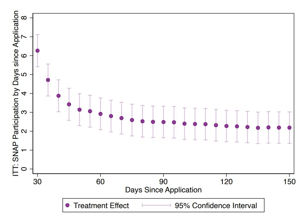 Figure 2: In Los Angeles, the gap in receiving benefits shrinks from the 6.2 points after 30 days to 2.2 points after 150 days, indicating that many people who are procedurally denied apply again and get approved
