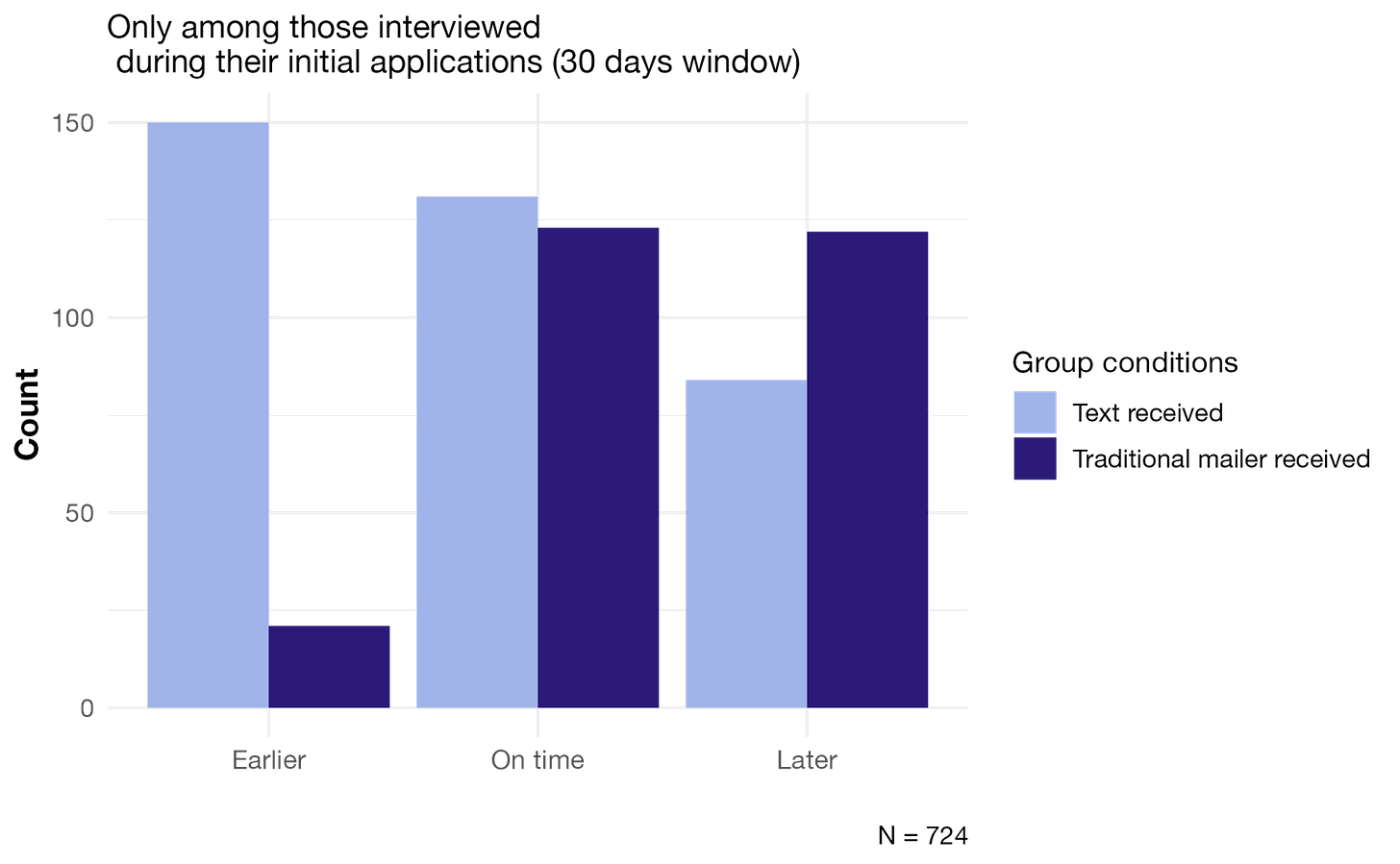 A follow-up survey in Boulder found that applicants who were sent texts were much more likely to say they knew what to do to complete their interview compared to those who only received mail notices with their scheduled interview time. The reduction in denial rates and the faster time to approval represented an increased value of applying to SNAP of nearly $100 over the initial six month benefit period for those who have access to the flexible interview process.