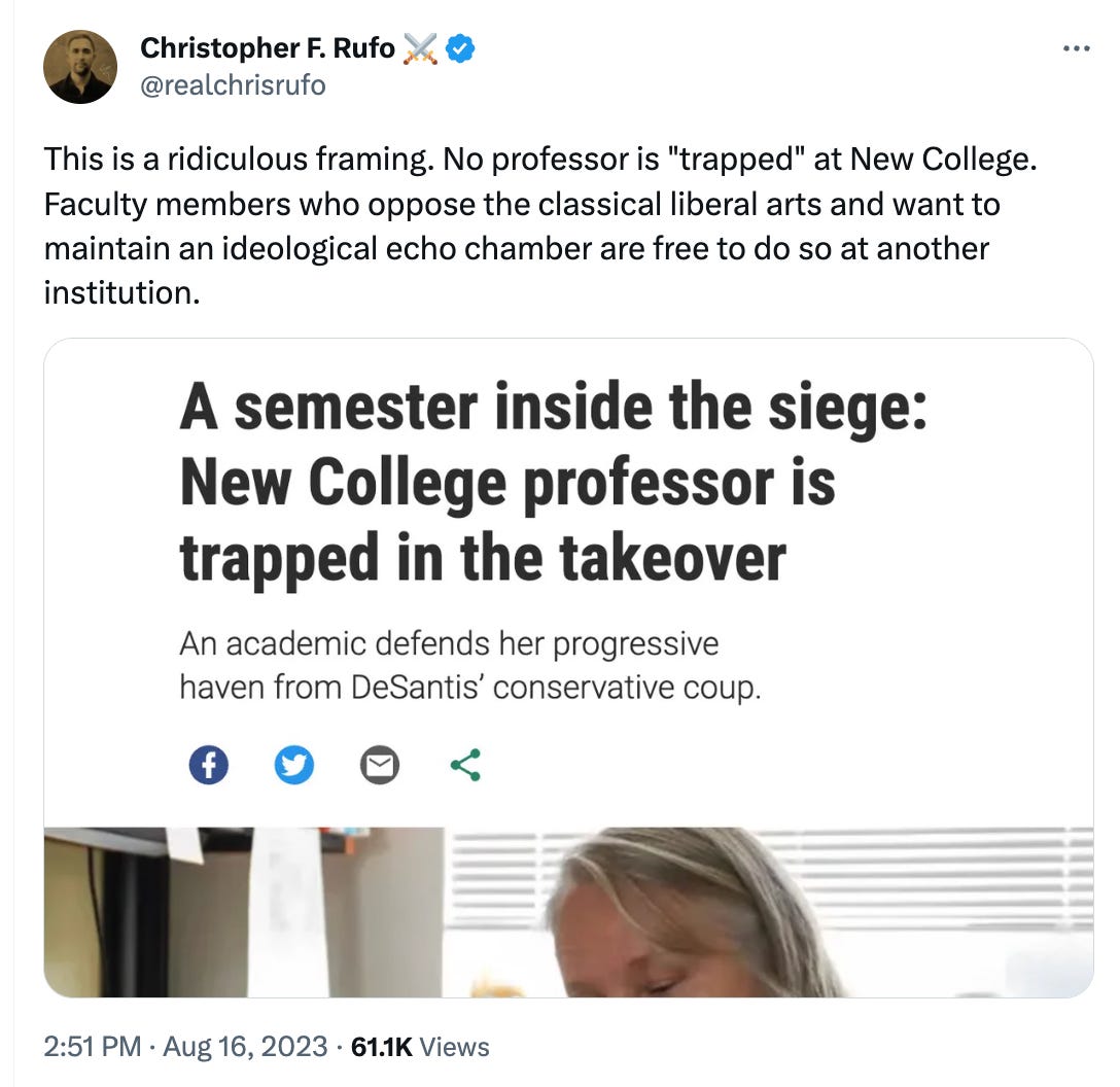 The thing is, Rufo and DeSantis are basically happy to have New College be a catastrophic mess this year, for two reasons.