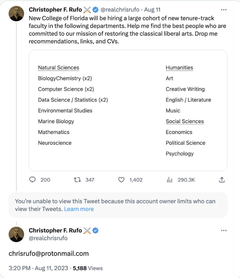 Rufo is now soliciting new faculty on Twitter, asking for personal recommendations. Let me just note that involving political appointees with zero expertise in research areas you are hiring for is also incompetence.