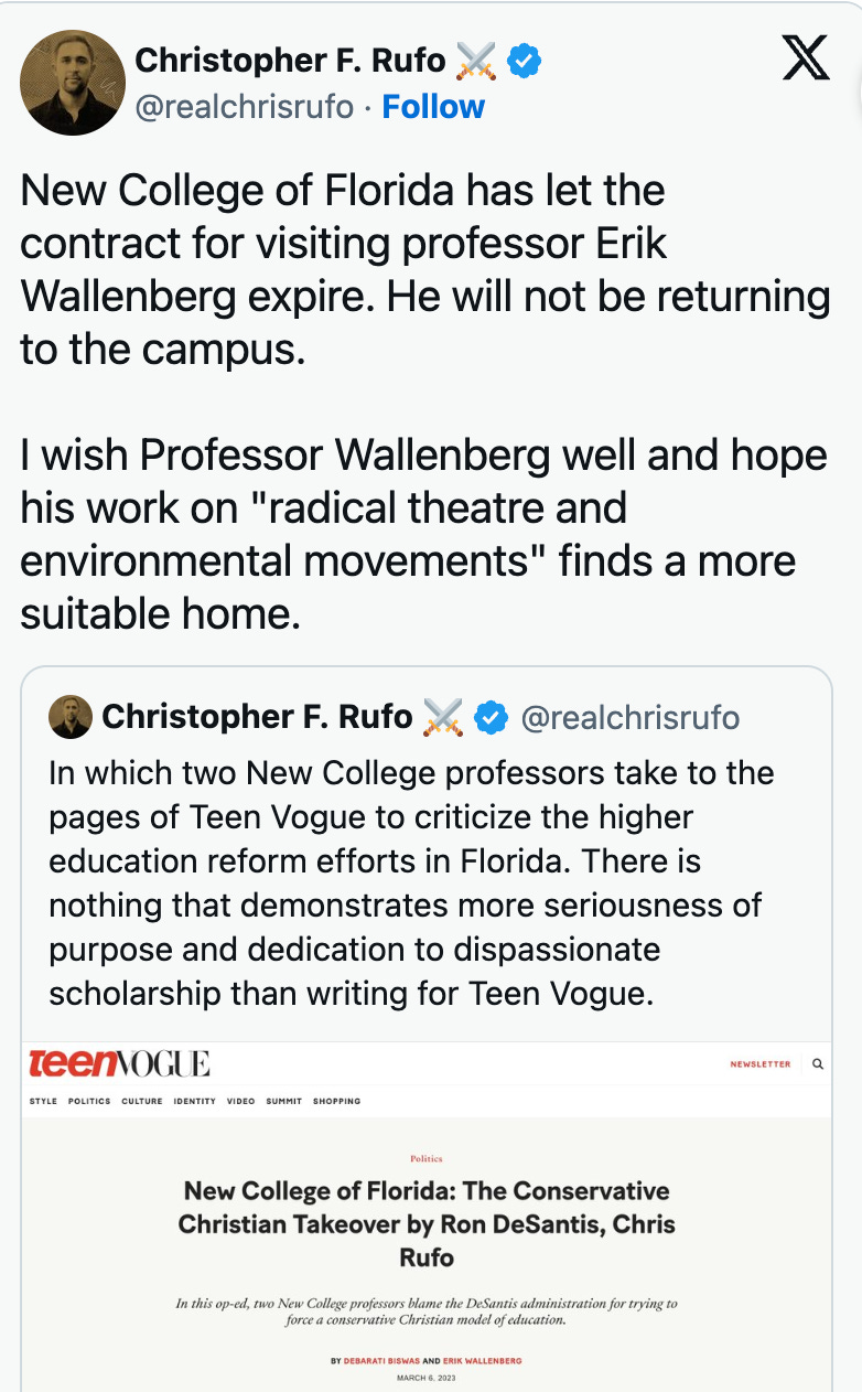 Her beliefs that trustees blocked her teaching is completely plausible. Chris Rufo, one of those trustees, boasted about the firing of an adjunct faculty member after they criticized the changes he and his fellow ideologues have made: