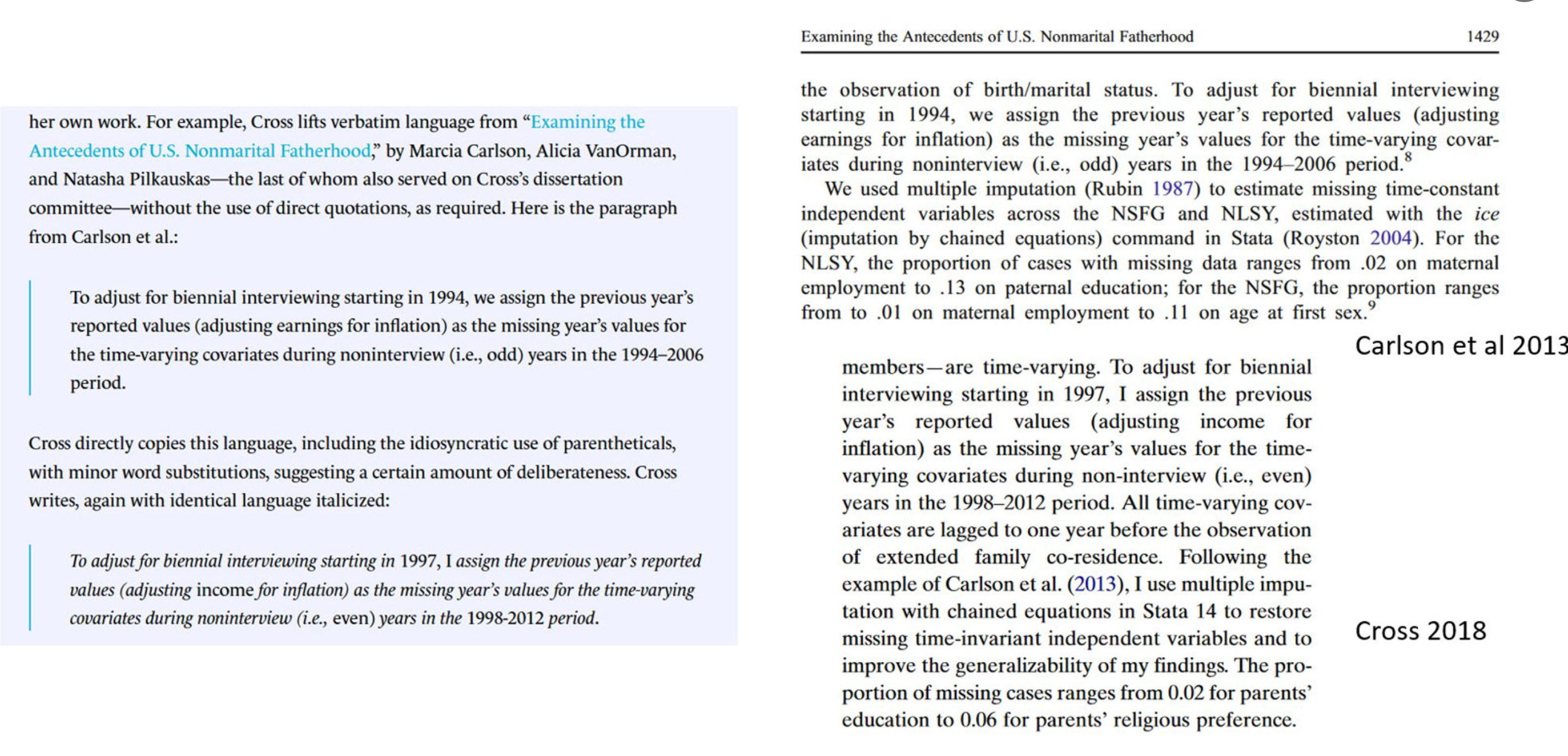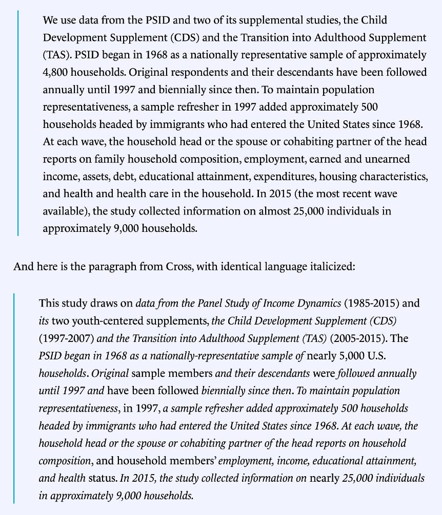 I reached out to one of the authors of the first paragraph, Paula Fomby (who has since co-authored with Cross and served on her dissertation committee). She pointed out that it would have been best practice for Cross not to cite her work, but instead to cite the PSID user guide (while noting that Fomby herself neglected to do so). She also said: “These are similar descriptions of a publicly available data resource, and I am not troubled by the overlap.” The other author, Stacey Bosick told The Harvard Crimson that she wasn’t “concerned that any path-breaking ideas have been stolen here” but was “more concerned about the disproportionate surveillance of black scholarship.”