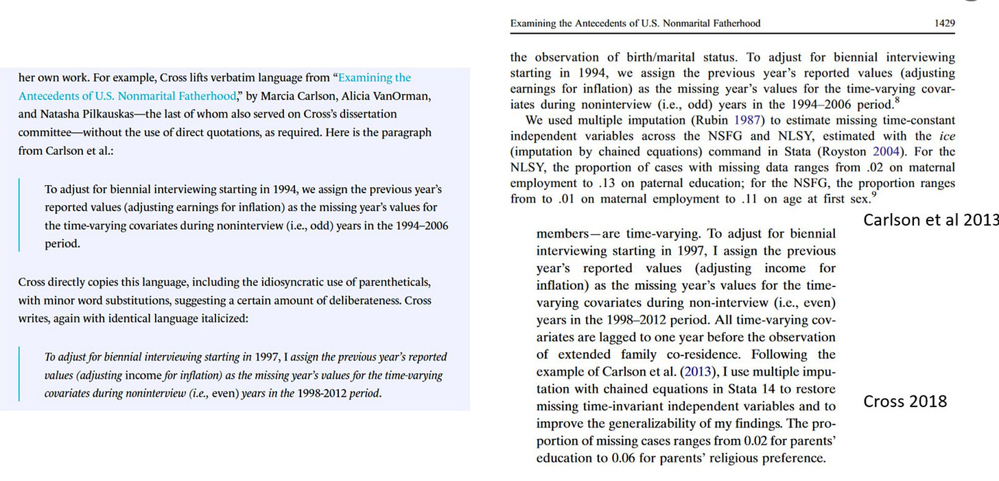 I also reached out to Marcy Carlson, of the Carlson et al. that Cross is accused of plagiarizing. She is a senior scholar in the field of demography that Cross works in, and so surely has some standing here. Her response: “This is far from academic plagiarism. Cross is simply describing a national data set, and she cites our paper in the very same paragraph!”