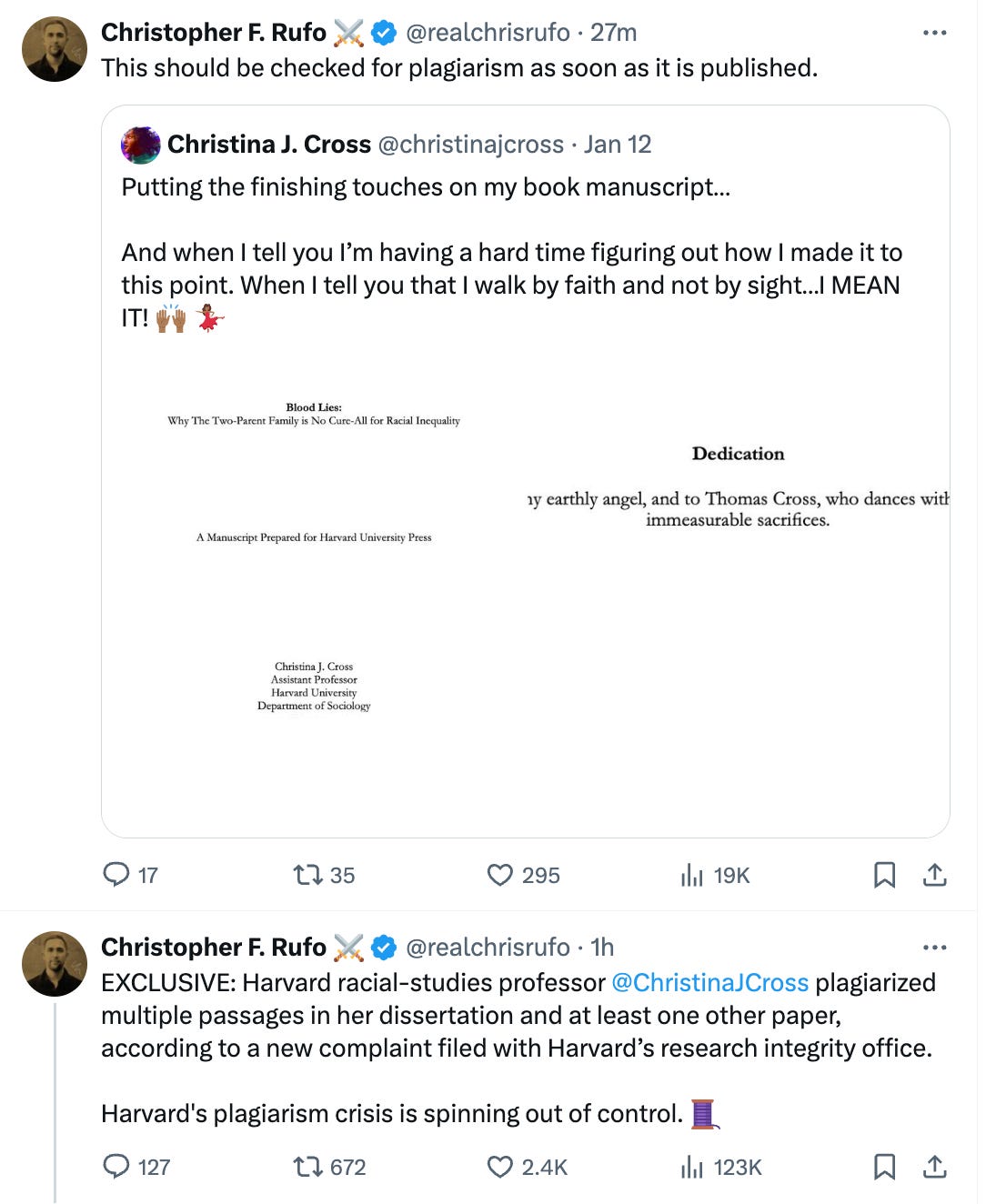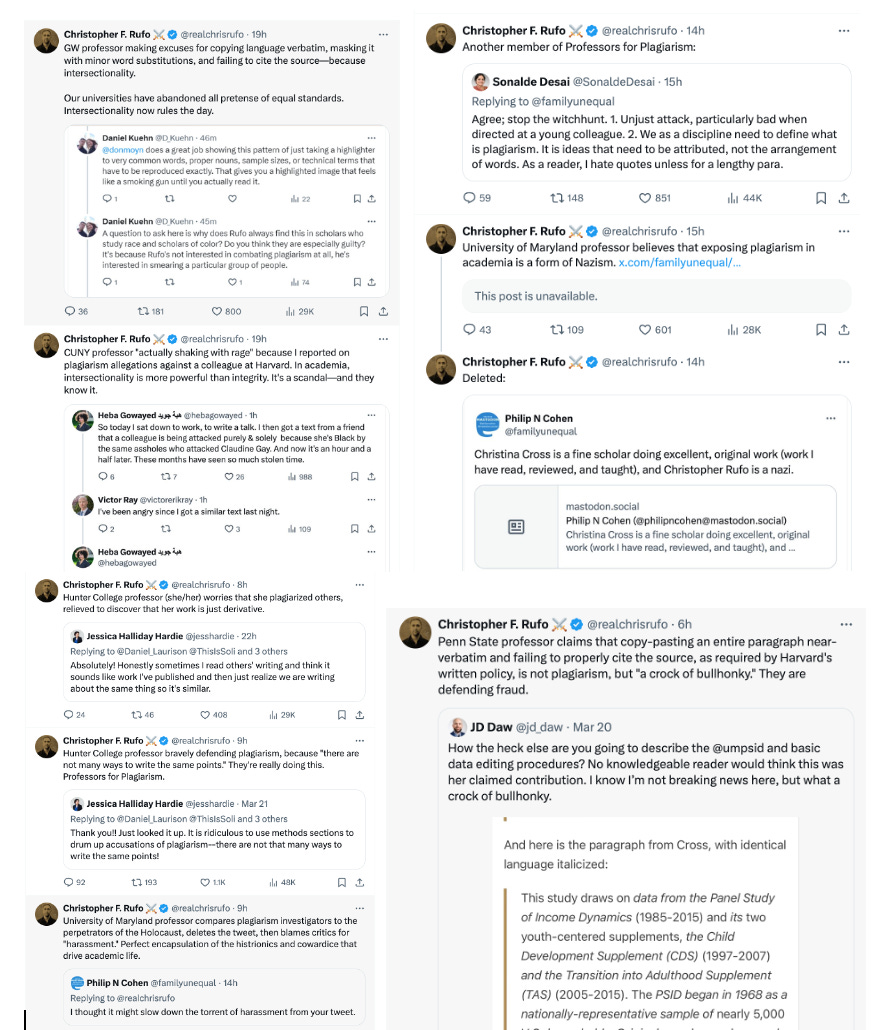 Chris Rufo, who coordinated the attack on Gay, announced he was creating a fund to investigate academics for plagiarism. We are now seeing the fallout of this movement. Rufo recently posted accusations against Christina Cross, who is an untenured Assistant Professor of Sociology at Harvard.