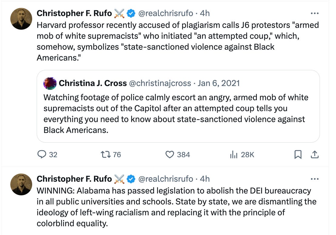 Institutions don’t have to voluntarily play along. I can tell you with a very high degree of confidence that Cross will not be punished for the simple reason that what she did does not constitute plagiarism in any meaningful sense. But while Rufo would prefer to see such academics removed, the strategy still works even when they stay in place: