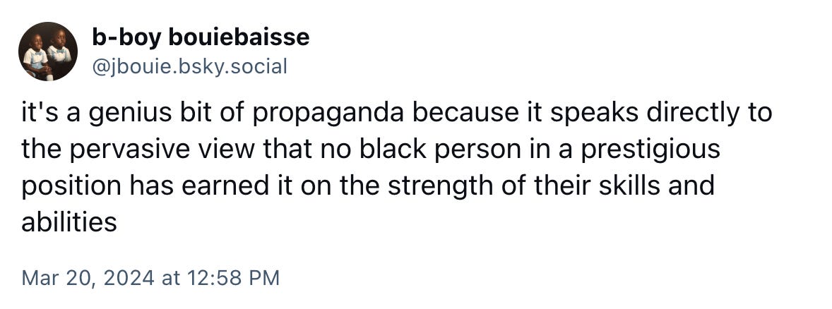 Third, the message is that the topic of race, and the Black scholars that disproportionately pursue the topic, simply do not belong in elite institutions. The mode and nature of the targeting feeds into prejudices, clearly felt by those doing the targeting. On BlueSky, Jamelle Bouie wrote “the key thing here is that "plagiarism" here means "being a black person in a prestigious position"":