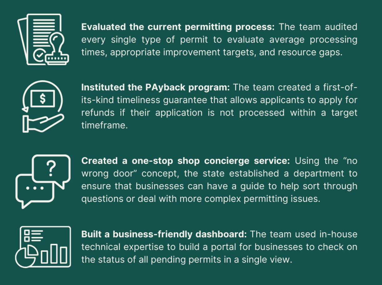 This specificity, and the support of the governor’s office, created a tangible framework to move forward. While the 90-day target for documenting all permits and their processing times was challenging, it was still achievable. The time-sensitive mandate propelled a reform that some aides suggested would have otherwise taken a year or longer. Cabinet secretaries understood they would have to either meet the deadline, or explain directly to the governor — in an in-person meeting in front of their peers — why they couldn’t. The visibility of the initiative also encouraged a sense of competition among cabinet officials. The mantra of “moving at the speed of business” was widely adopted among those working with the governor.