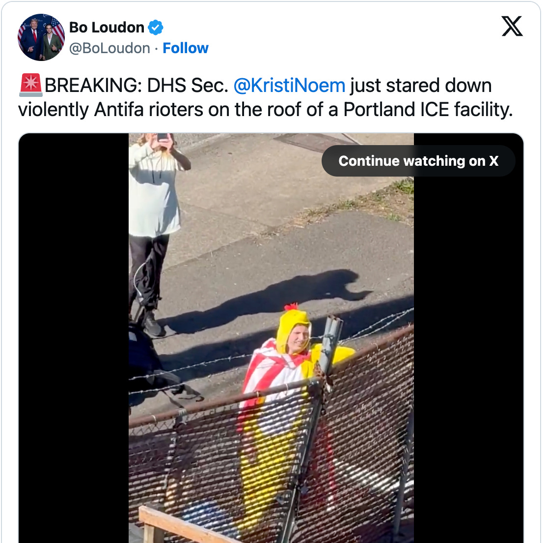 The propaganda is deeply out of touch with reality to the point that we pass into the surreal. The defining images of Portland or Kristi Noem having a staredown with a man in a chicken outfit…