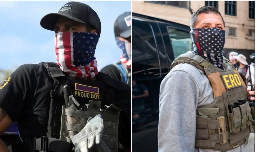 Look at the picture above. One of these is a member of a private militia that supports the President and was involved in an violent effort to overturn the election, the other is an agent of the state. Can you tell the difference?