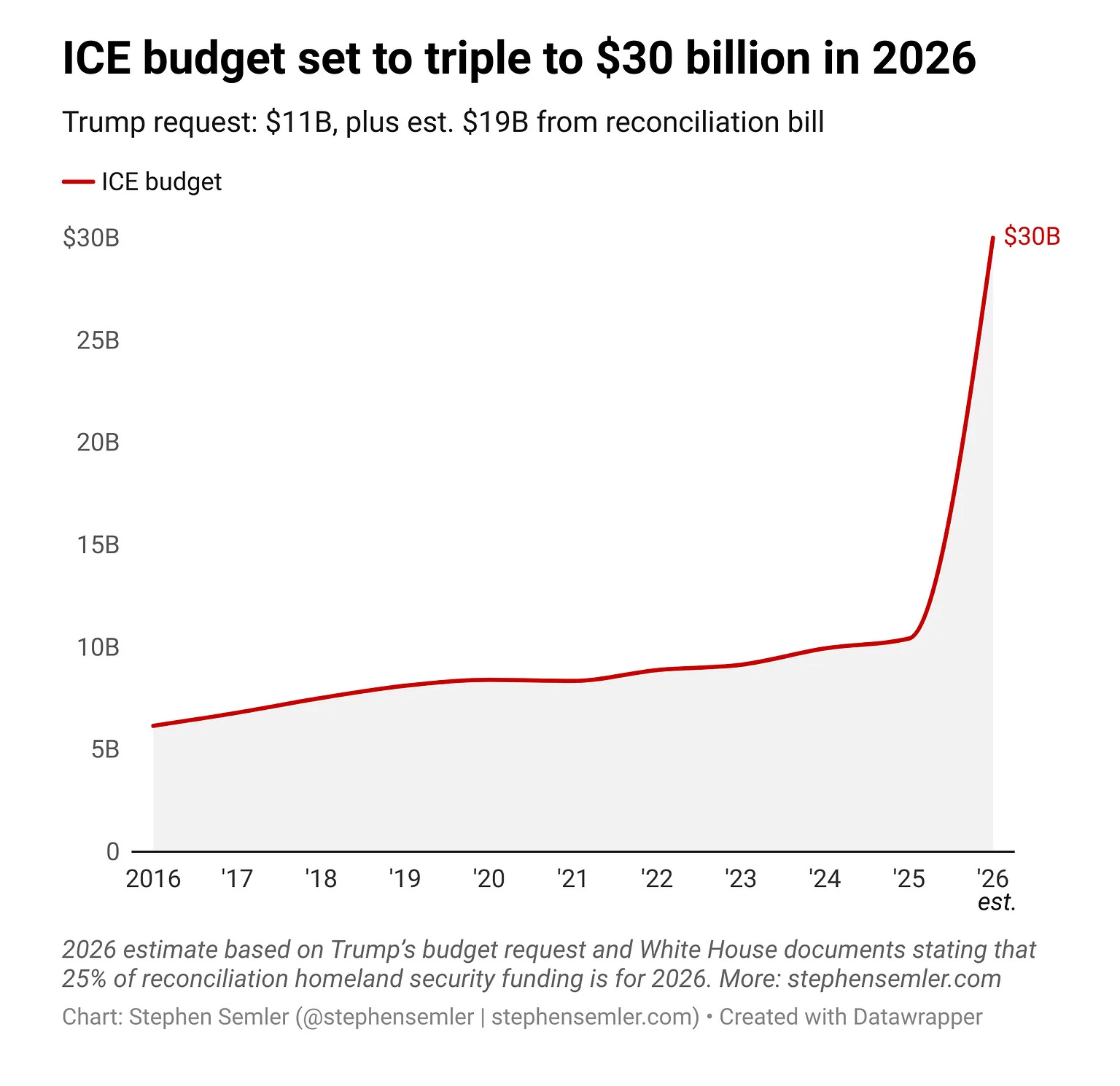 ICE tripled its budget to over $28 billion per year, allowing it to hire 10,000 new agents. It’s new annual budget is larger than the FBI, Drug Enforcement Administration (DEA), Bureau of Alcohol, Tobacco, Firearms and Explosives (ATF), U.S. Marshals Service, and Bureau of Prisons combined.