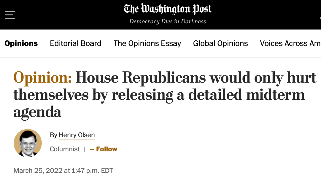Actual GOP policy plans are, if you forgive the hackneyed metaphor, the Bruno of American politics, the thing we don’t like to talk about. After not having a party platform in 2020, Republicans are also skipping any official statement of midterm policies. Mitch McConnell and Scott are feuding about the Rescue America plan, not on matters of substance but because McConnell believes that Republicans are better off if they do not reveal their policies. Its a view shared by the conservative intelligentsia and its probably correct just on purely strategic grounds.