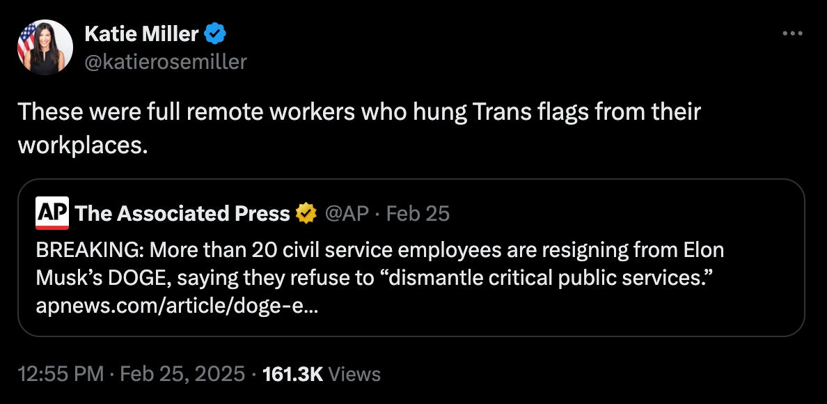Miller does not explain how fully remote workers posted “trans flags” (or rainbow flags for the rest of us). But she herself is representative of DOGE. She has no tech skills, which is fine for a PR person. Her husband, Stephen Miller, has been described as the “Prime Minister” aiding Musk. Musk had previously given Miller’s political groups $50 million dollars. These are the people running tech in government now. (One more fun fact about Katie Miller: According to Wikipedia, she destroyed “hundreds of copies of the school's newspaper, after it endorsed an opposing student government candidate.”