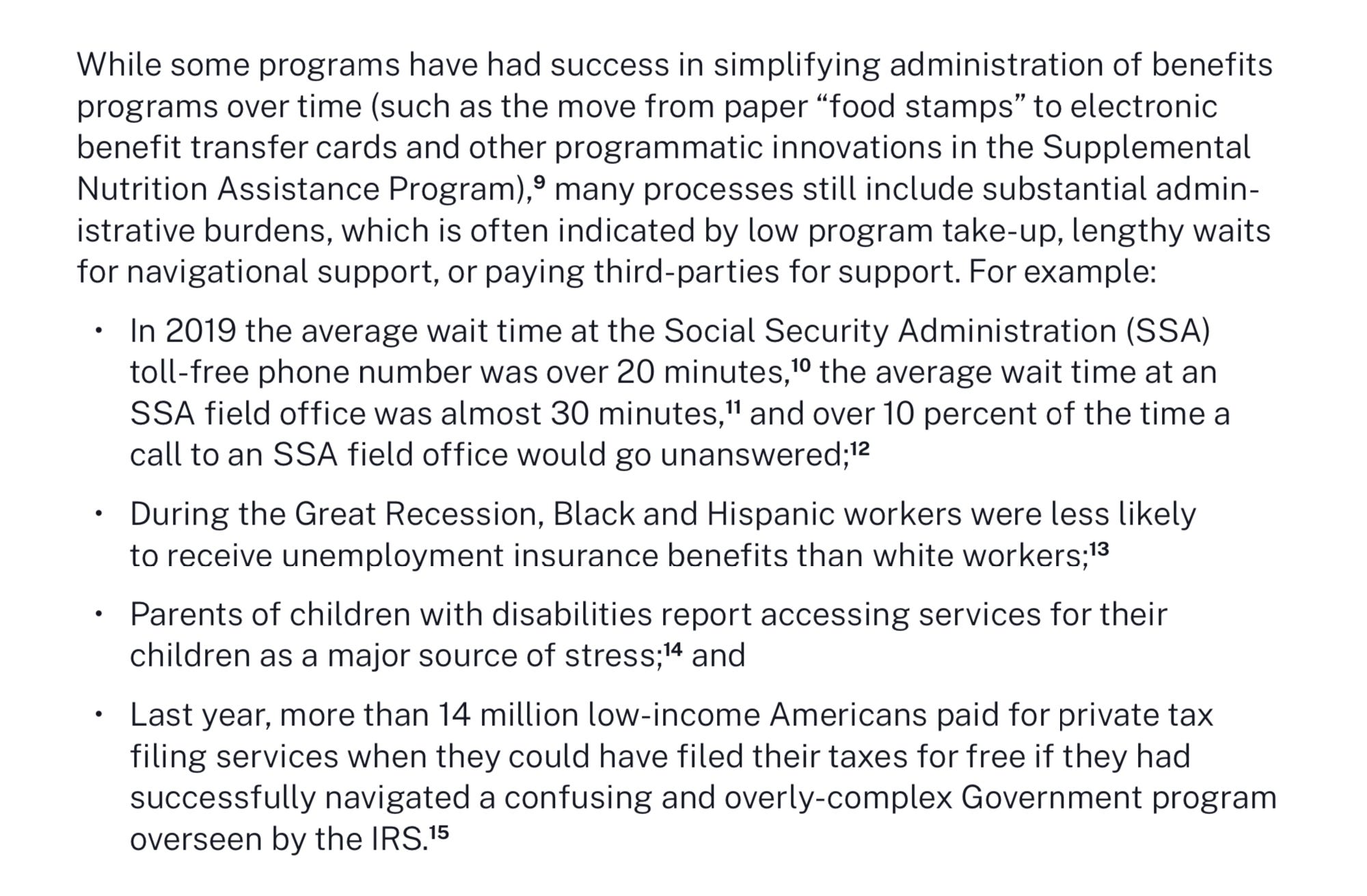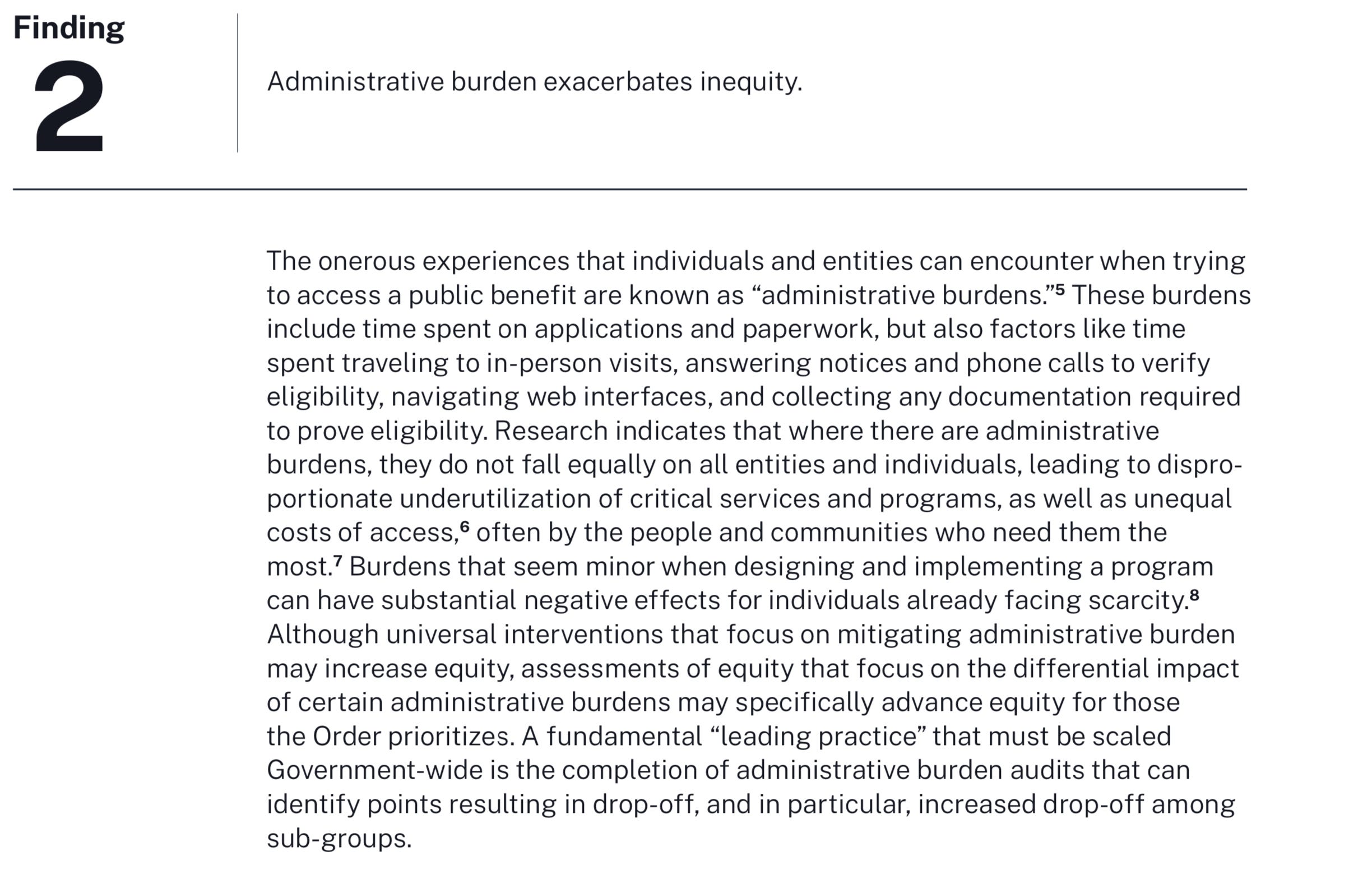 The report draws on research from economics, public policy and public administration. It describes how burdens led to the types of barriers that lower take-up to crucial services that Biden’s EO referenced.