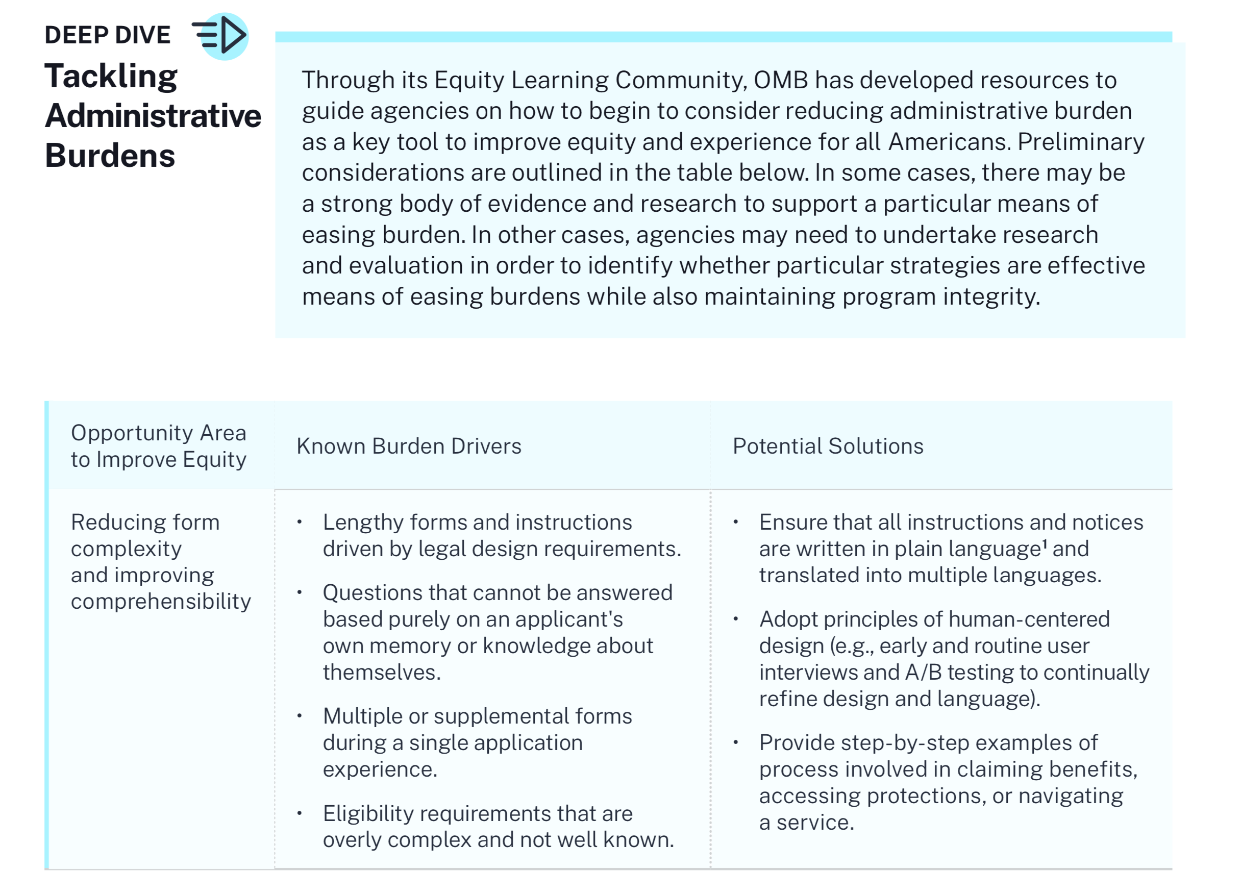 Finally, OMB provides a deep dive analysis of administrative factors that create burdens, and potential solutions (sample below).
