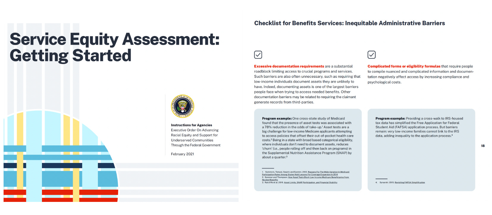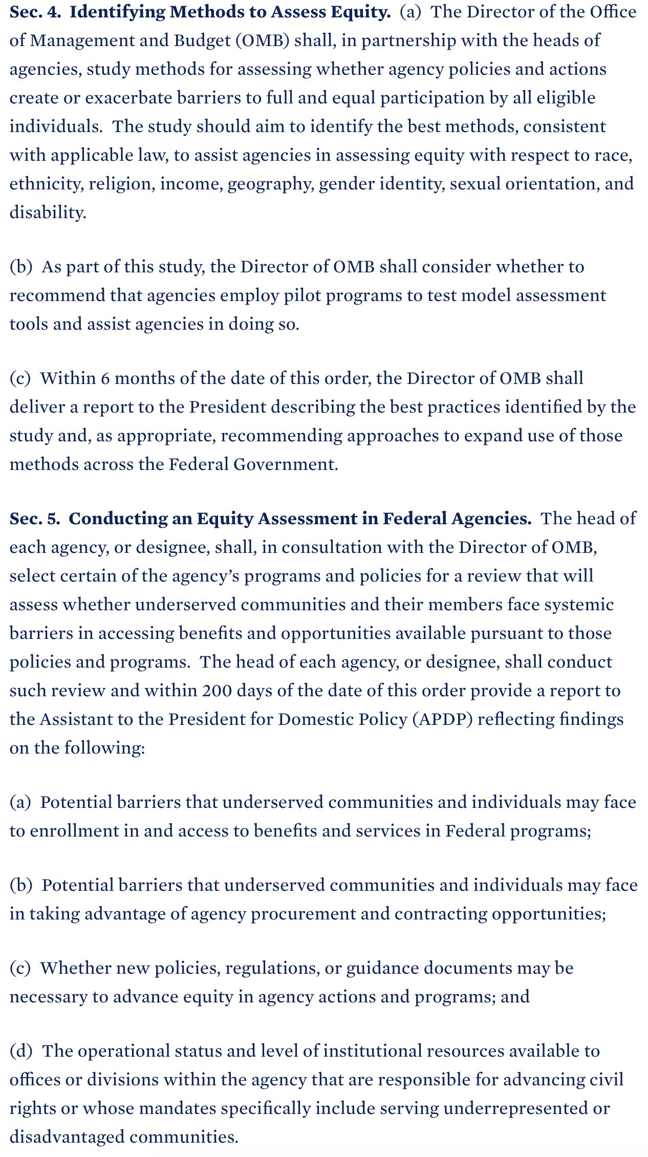 Under the order, the Office of Management and Budget is told to look for practices to improve equity, and for federal agencies to conduct equity assessments (see sections 4 and 5 of the order, below). Crucially, the order identifies “barriers that underserved communities and individuals may face to enrollment and in access to benefits and services in Federal programs.”
